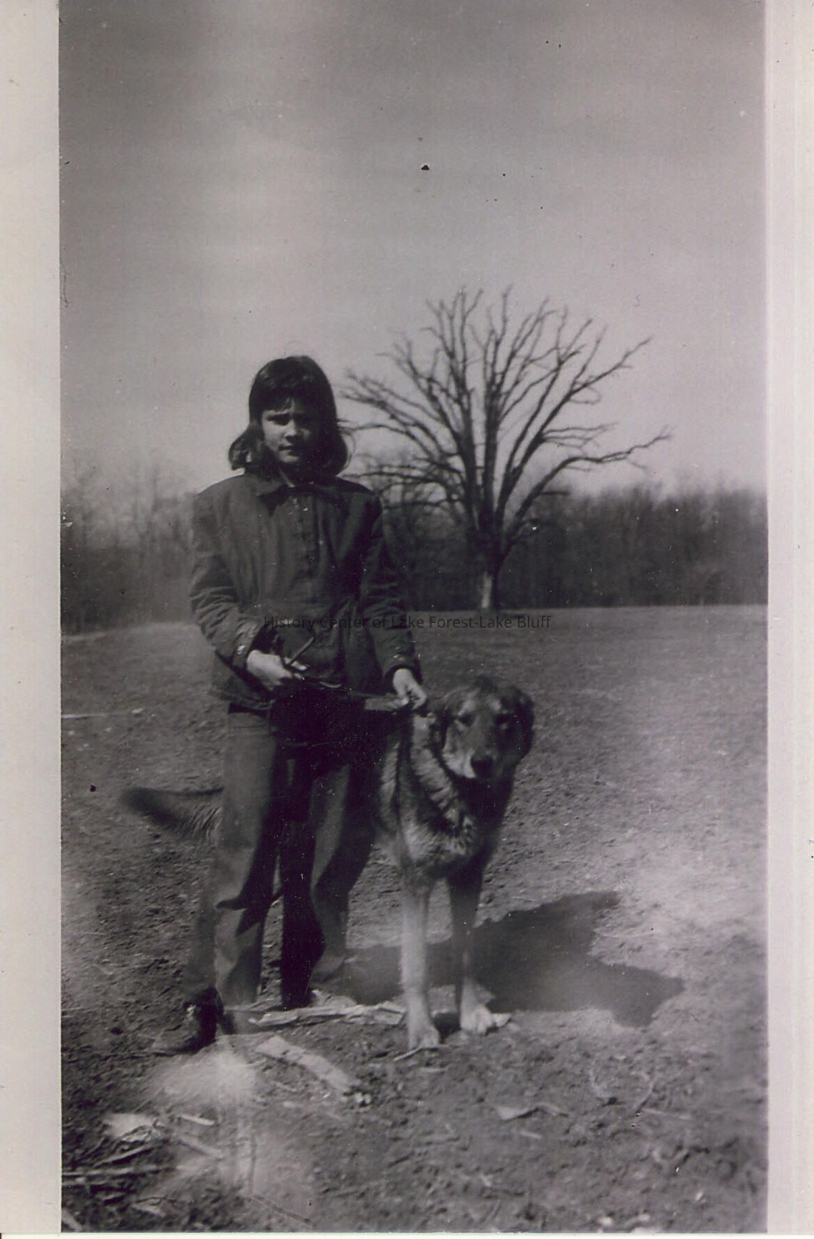 According to neighbor Ron Seyl, "Penny Palmer with neighbors the Pavlovich's dog Rusty. Penny is standing near what would be the east curb of Littlefield Court today. At the time this was the Pavlovichs' Old Mill Gardens and Hobby Farm. The big tree in the background is where 1540 Littlefield Court is today. Penny was very popular, a great horsewoman, worked at Onwentsia Stables with Mr. Hewitt. She broke and trained the Pavolvichs' colt Cheyenne. The Palmers lived across the road and had 4 horses in a 3-car garage. Mr. Palmer was a war hero from WWII, a great guy! His ashes were sprinkled on the property after they moved. They loved 1787 Old Mill. The property was the Tully farm house bought by Albert Lasker, 80+ acres and they made Lasker building them a house (Brick) third west of Telegraph, north side. The farm's now Wedgewood Subdivision."Lexicon
