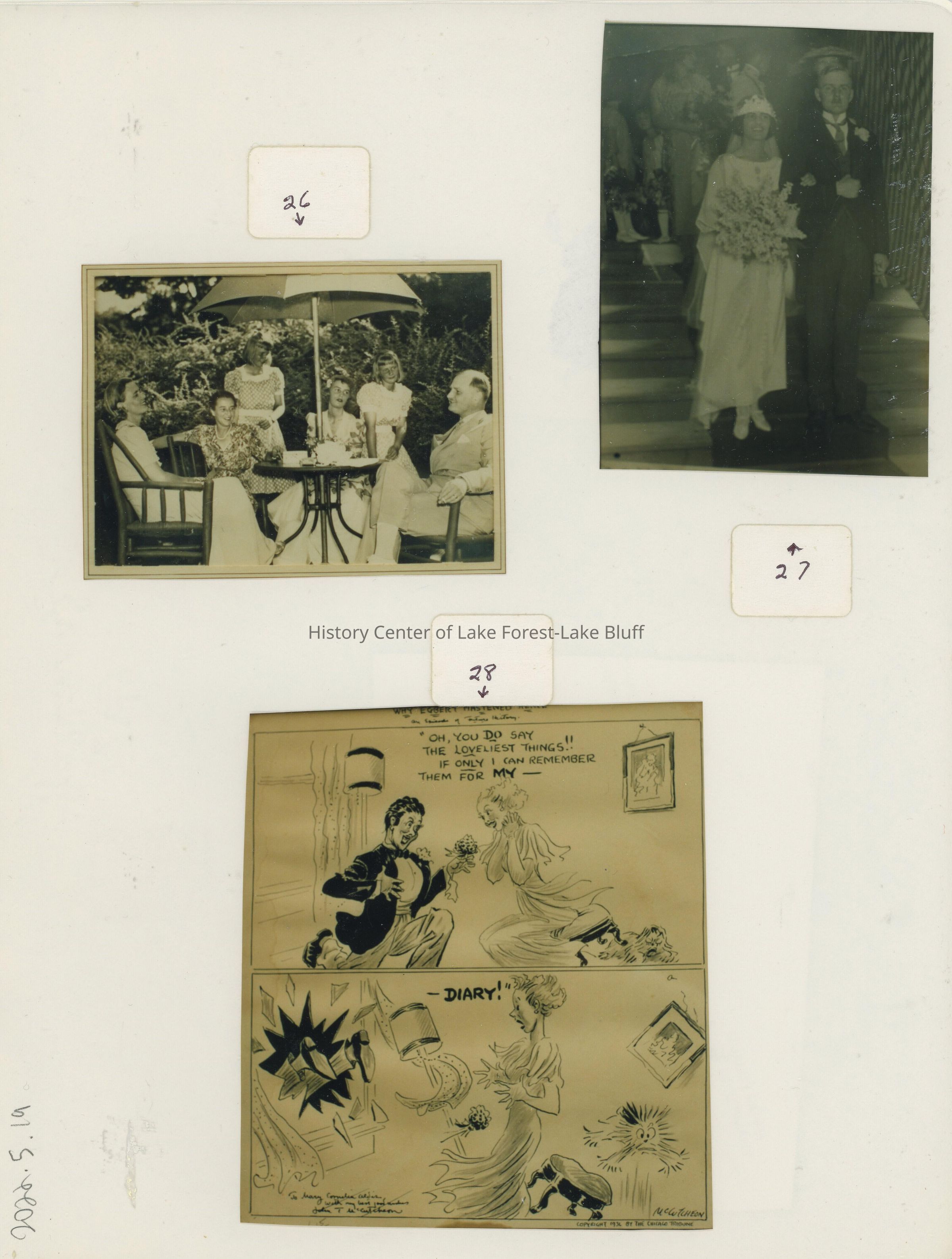 "#26: Mary Cornelia [wife of donor, Roy Porter], like them all, doesn't admit to coming out parties. But, there she is, in the garden, when it is all over, seated between the twins - Peggy and Ruth. Dorothy, and everyone else arre hanging on what ever Graham has - is - saying. The other person is Mrs. Roger Branson, Auntie Mouse as we all called her, equally fascinated with what Grum is saying. Wonder what it was to command such attention?"