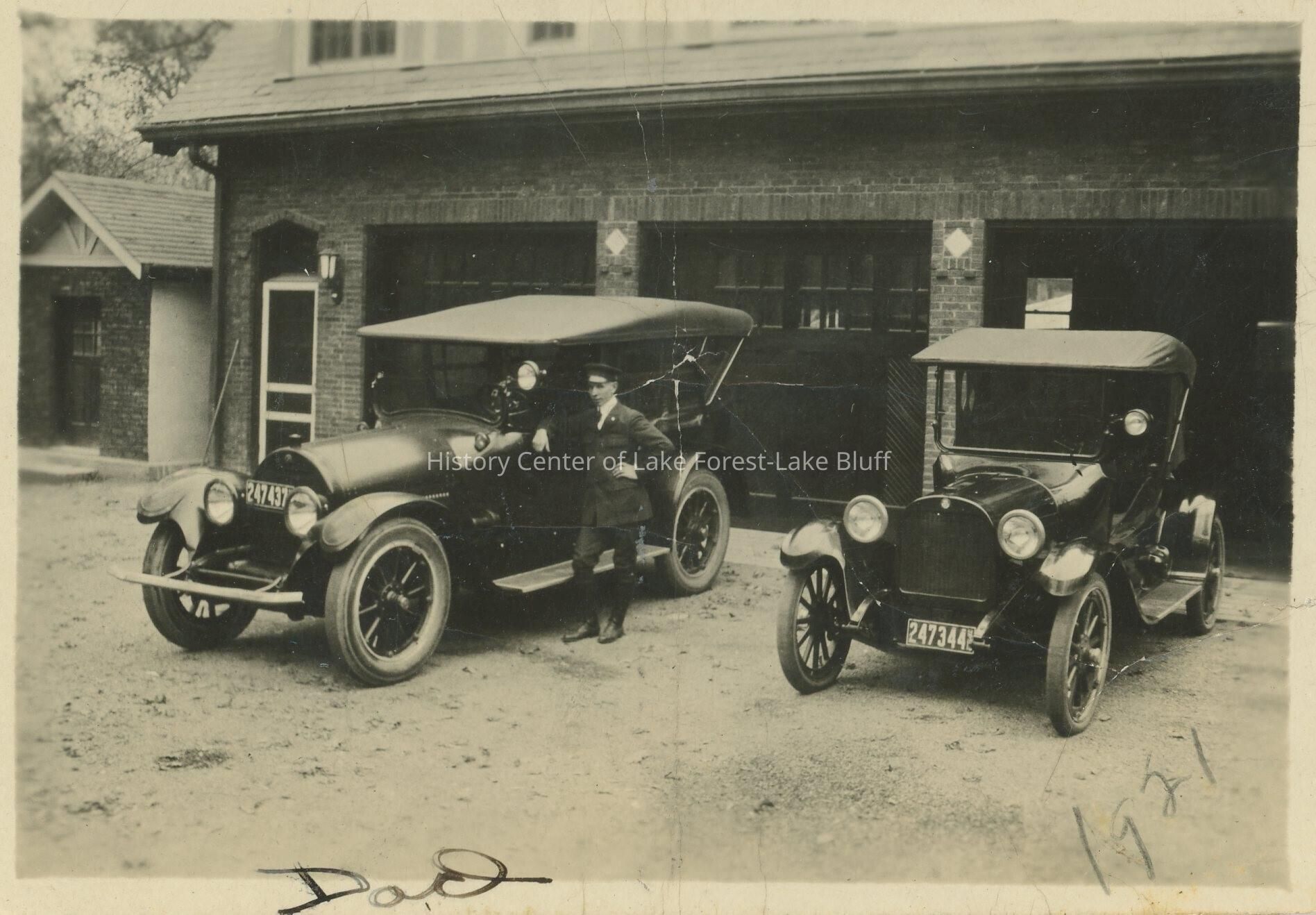 Small wallet-sized photograph of Arthur G. Kelley posing in front of two cars. Kelley worked as a chauffuer to the Pincoff family and is most likely posing in front of their vehicles, at the Pincoff House in Chicago. On the bottom of the photograph is "Dad", written in pen, and "1921", written in pencil.