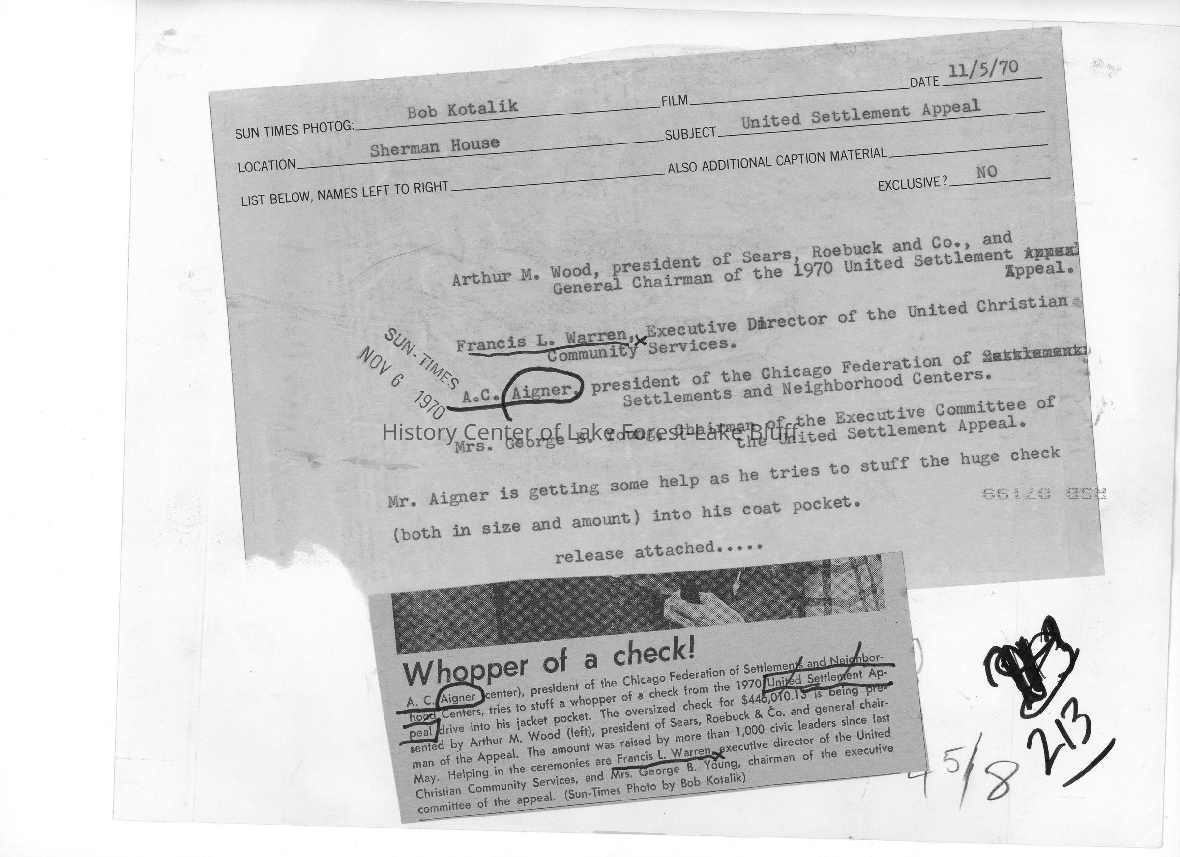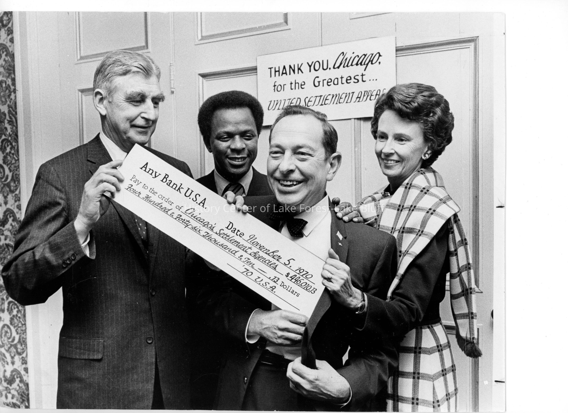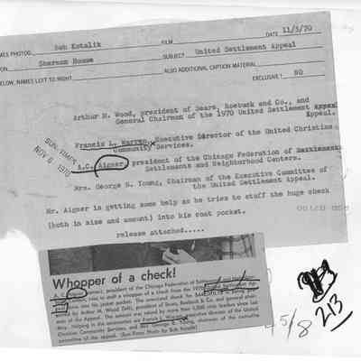 Photo of Arthur M. Wood, Francis L. Warren, A. C. Aigner, and Mrs. George B. Young. Aigner is trying to stuff a giant check into his coat pocket from the president of Sears, Roebuck, & Co.Made/Created