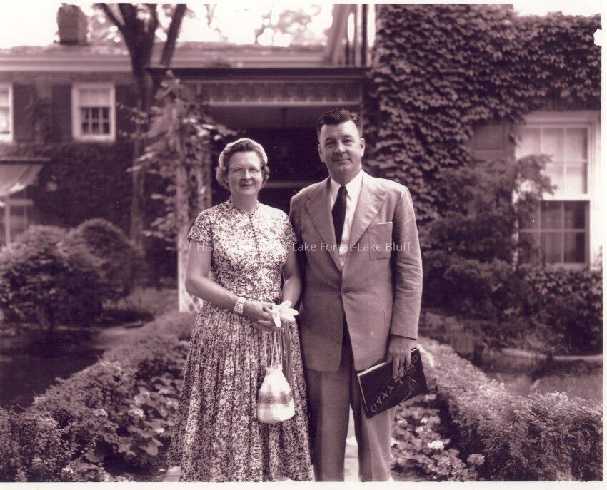 They are standing in front of one of the Gatehouses at Elawa Farm, now the home and design offices of Craig Bergmann Landscape Design and Paul Klug, Inc. Interior Design at 1065 Acorn Trail, Lake Forest.