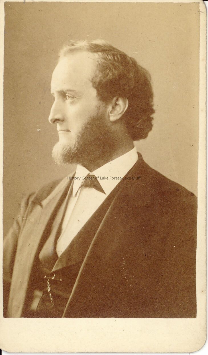 Photo of bearded man in profile to the left, Harvey family member, Lake Bluff. He wears a suit with vest and jacket. Back of photo reads: "Rider & Barnard, 335 West Madison Street, Chicago, Bishop or Bishof Fowler?Lexicon