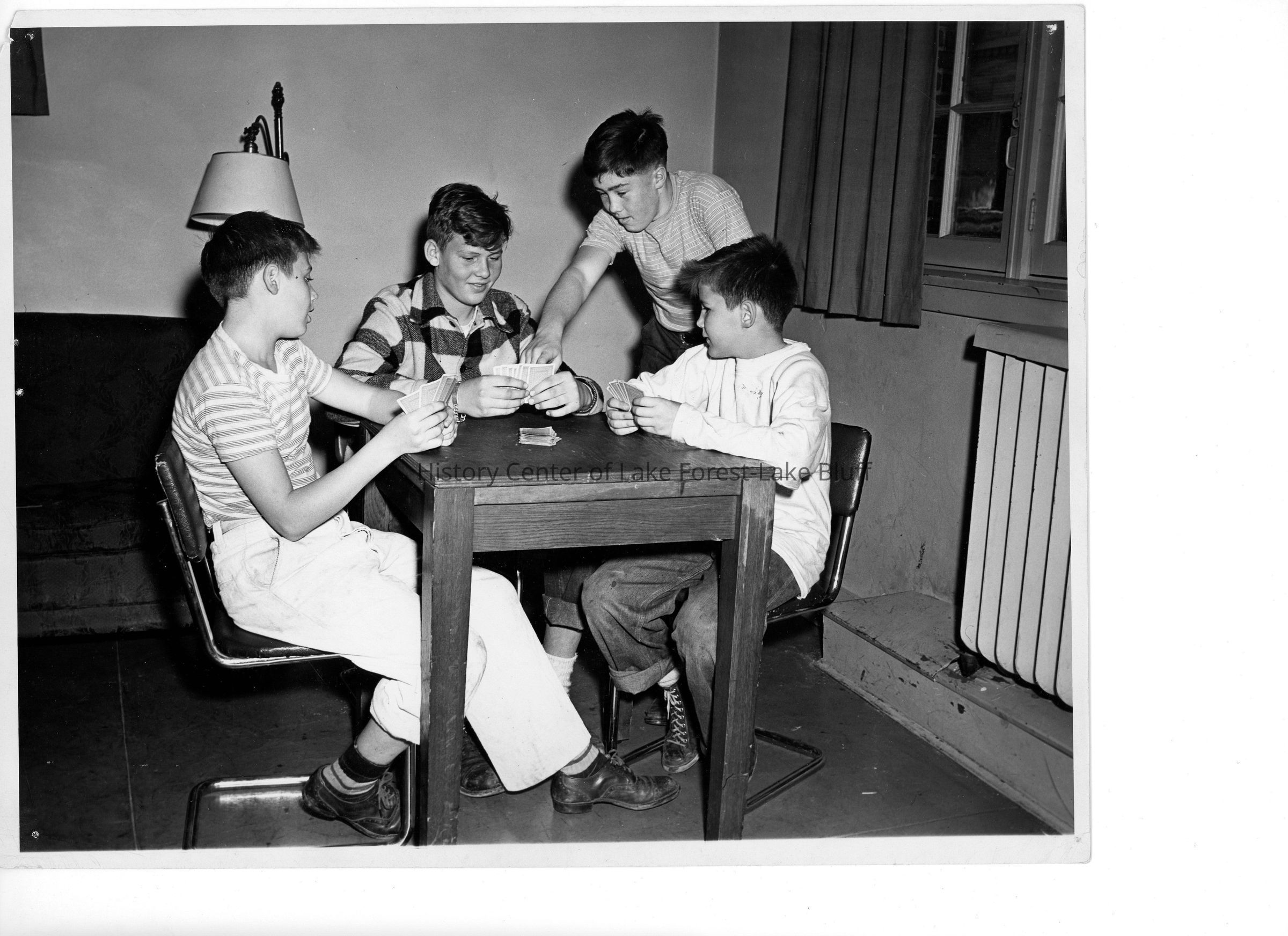 Photo of 4 unidentified boys playing cards.