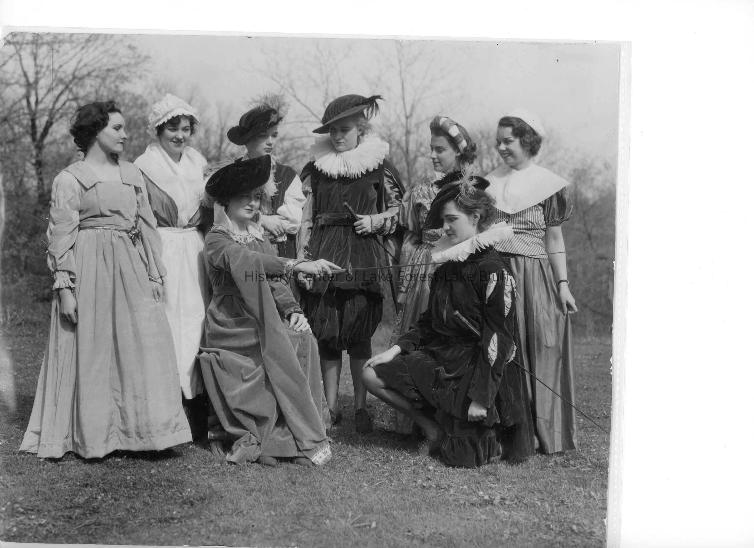 "Elizabethan play for Ferry Hall May Day. Gay costumes of Merrie England will enliven the campus of Ferry Hall, Lake Forest, next Tuesday with the presentation of 'The Laughing Mind' by students. Left to right (standing): Patricia Wilson, Marion Stiles, Jane Skidmore, Vivian Graham, Helen Brobeck, and Mary Snoddy. Front row: Betty Mangos and Betty Sturgeon."