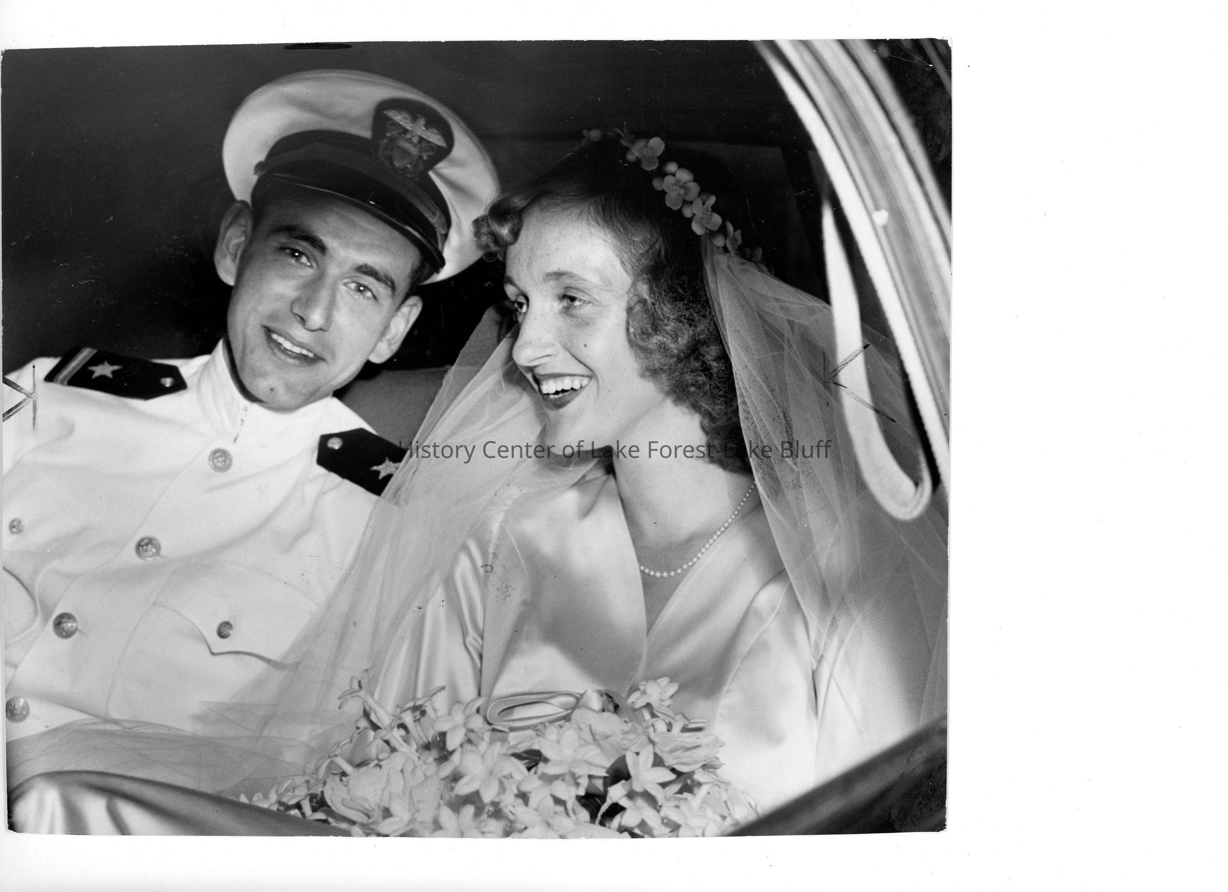 "Gold braid vied with bouquets and bridal finery as Frances Reid Clow became the wife of Ensign Lloyd Wheaton Bowers at Lake Forest's Presbyterian church in one of the most notable weddings of the season. Happy couple smiled at friends before driving away." Credit: Chicago Daily News.