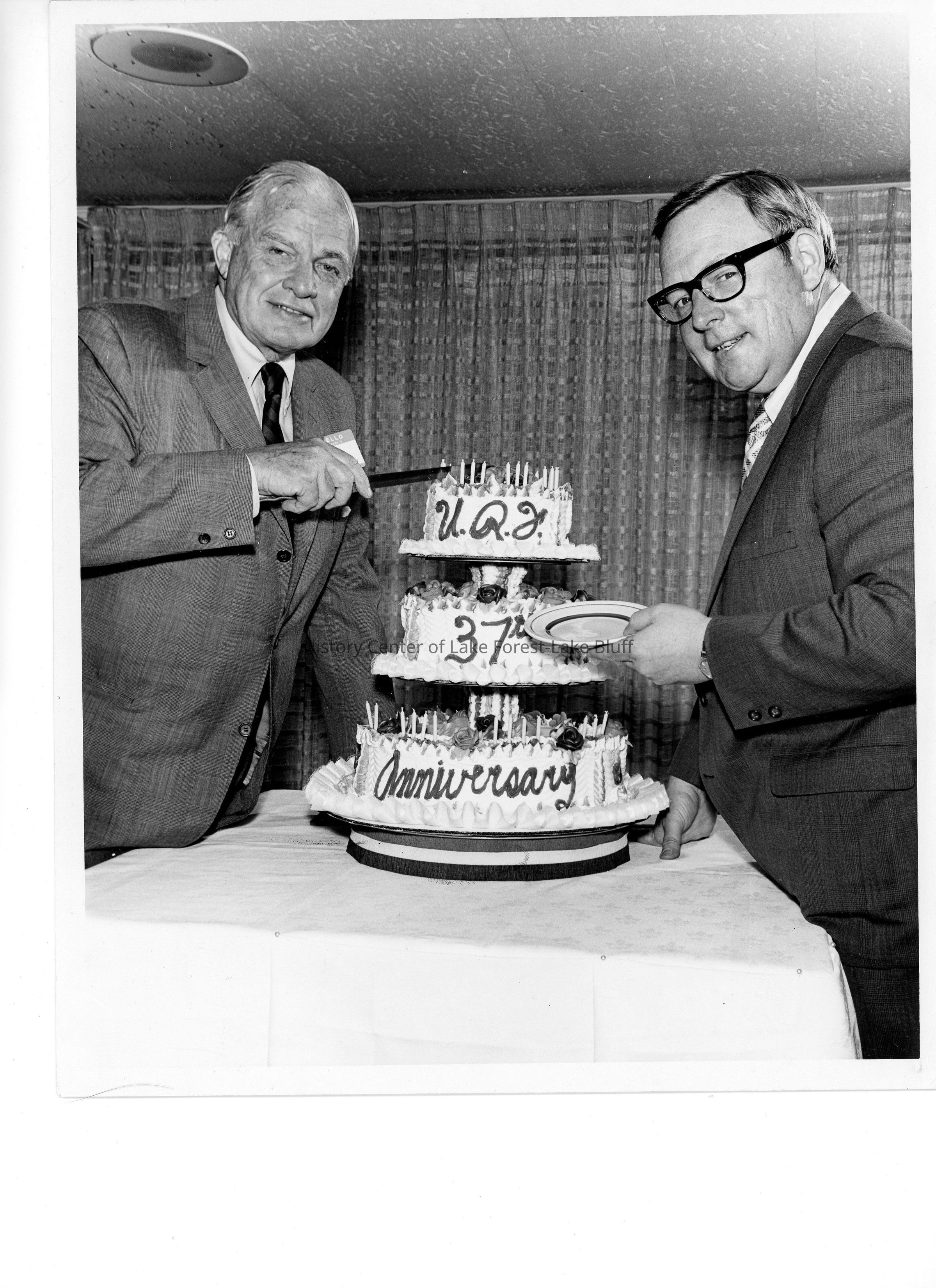 "Governor Richard B. Ogilvie ready to accept the first slice of cake baked for the 37th anniversary of United Republican Fund of Illinois from William Harrison Fetridge, president (left). The Fund has raised more than $26 million for the Republican Party. Meeting in Springfield, the organization's board of governors approved goals of 50,000 dues-paying members and $2 million by the 1972 national election." Credit: Field Enterprises Inc.