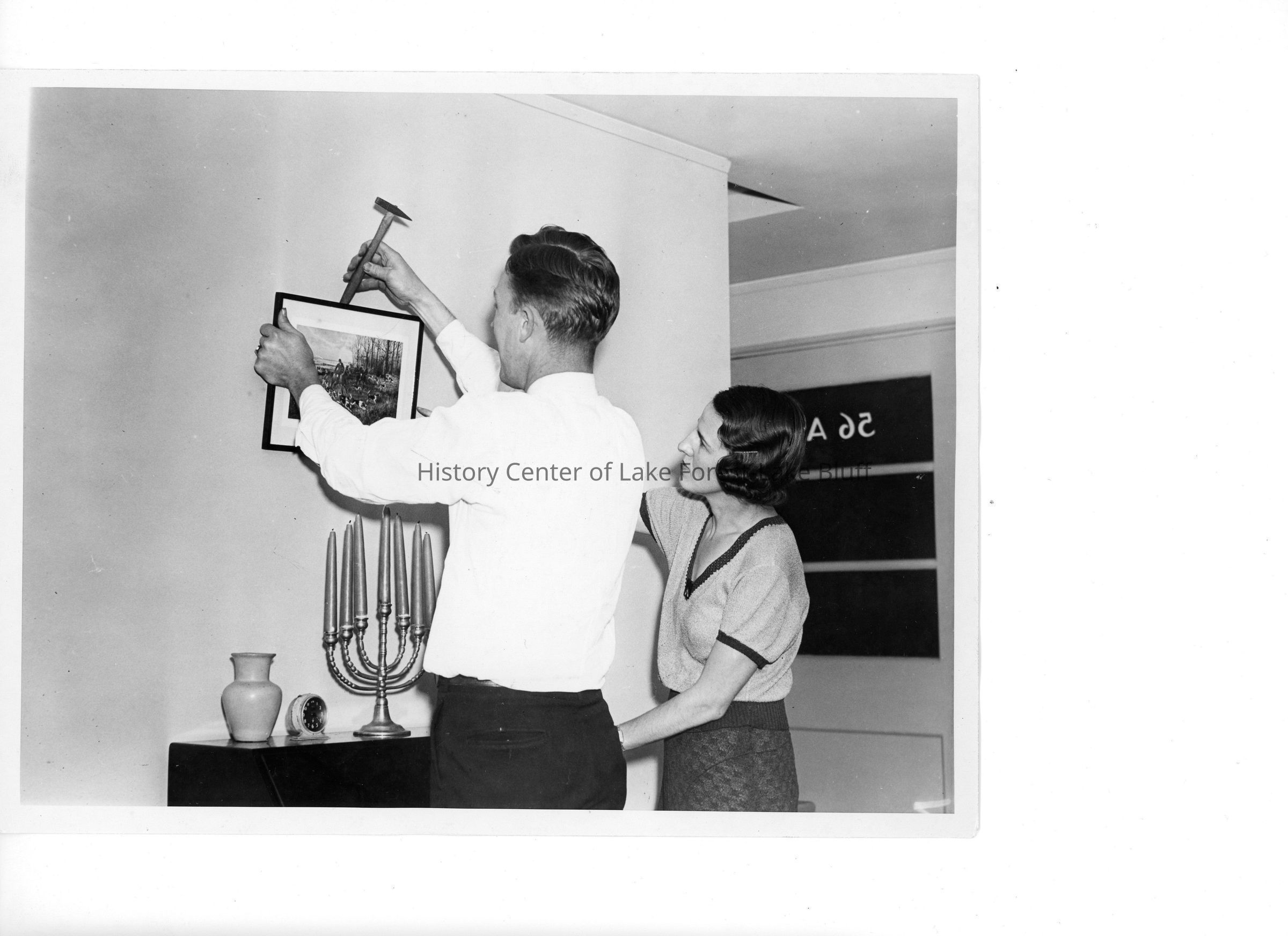 "Mr. and Mrs. Robert Templeton are trying to decide just where this picture should hang. He is marking the spot with the handle of a hammer."