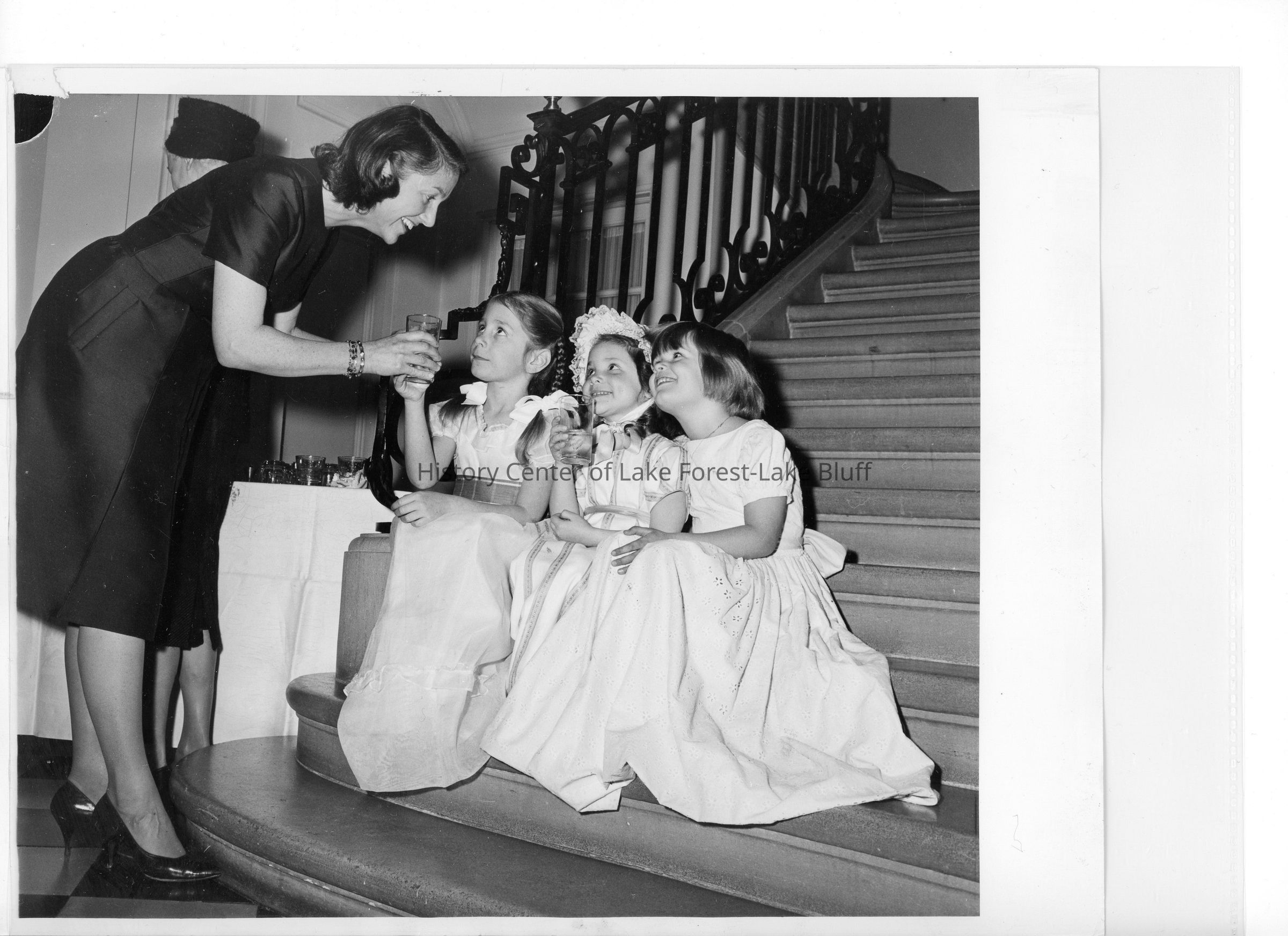 " Bringing refreshments to three young actresses, Mrs. William H. Rentschler compliments (left to right) daughter Phoebe, Edie Farwell, and Betsy Whipple, on their ability at adding atmosphere to a luncheon attended by supporters of the Allendale School for Boys Tuesday in Lake Bluff." Credit: Chicago Daily News.