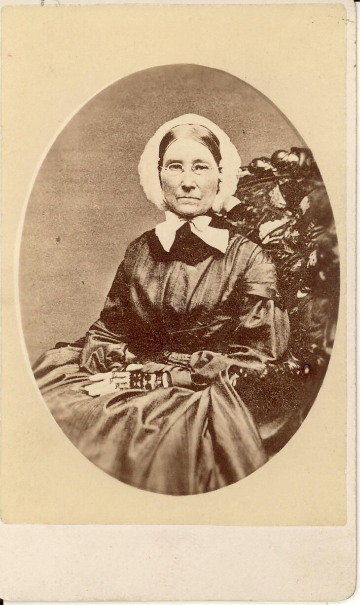 Portrait of older woman in profile to the left, seated. She wears a hat and glasses, a long dress and back of chair can be seen in photo. Back of photo reads: "Maria T. or J. Asgood, die March 15th 1880, aged 87 yrs."Lexicon