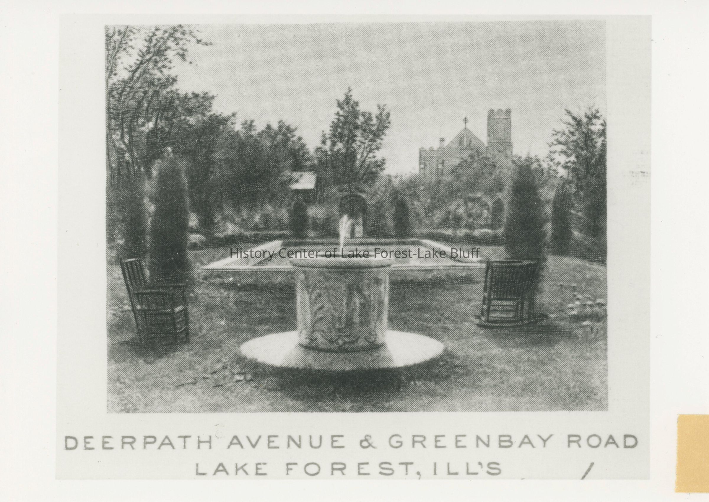 Undated photograph of the fountain and water fixture on the Aldis Compound. Caption reads "Deerpath Avenue & Green Bay Road, Lake Forest Ill's" Object is a recent photograph of the older original. Dating for orignal unknown as well.