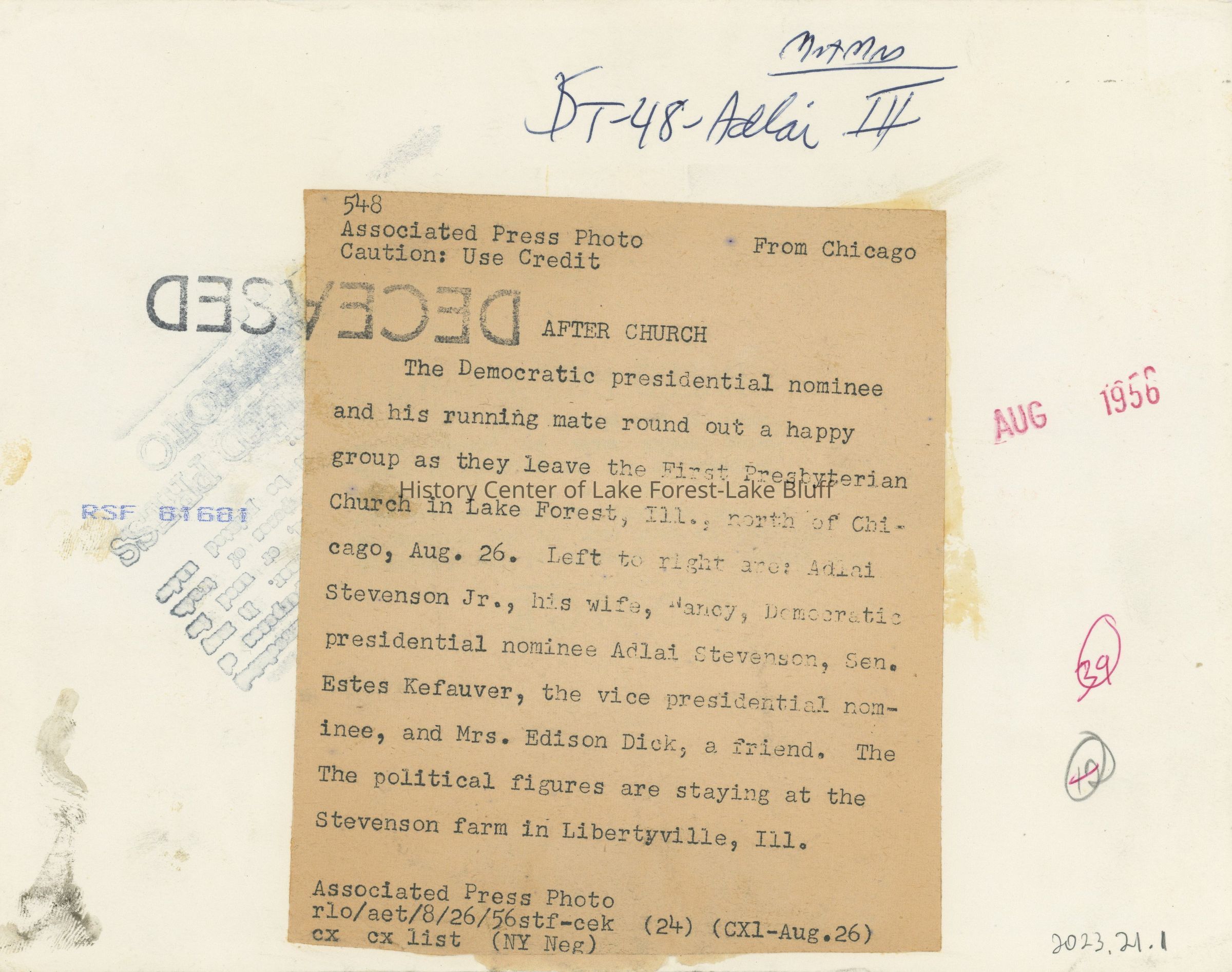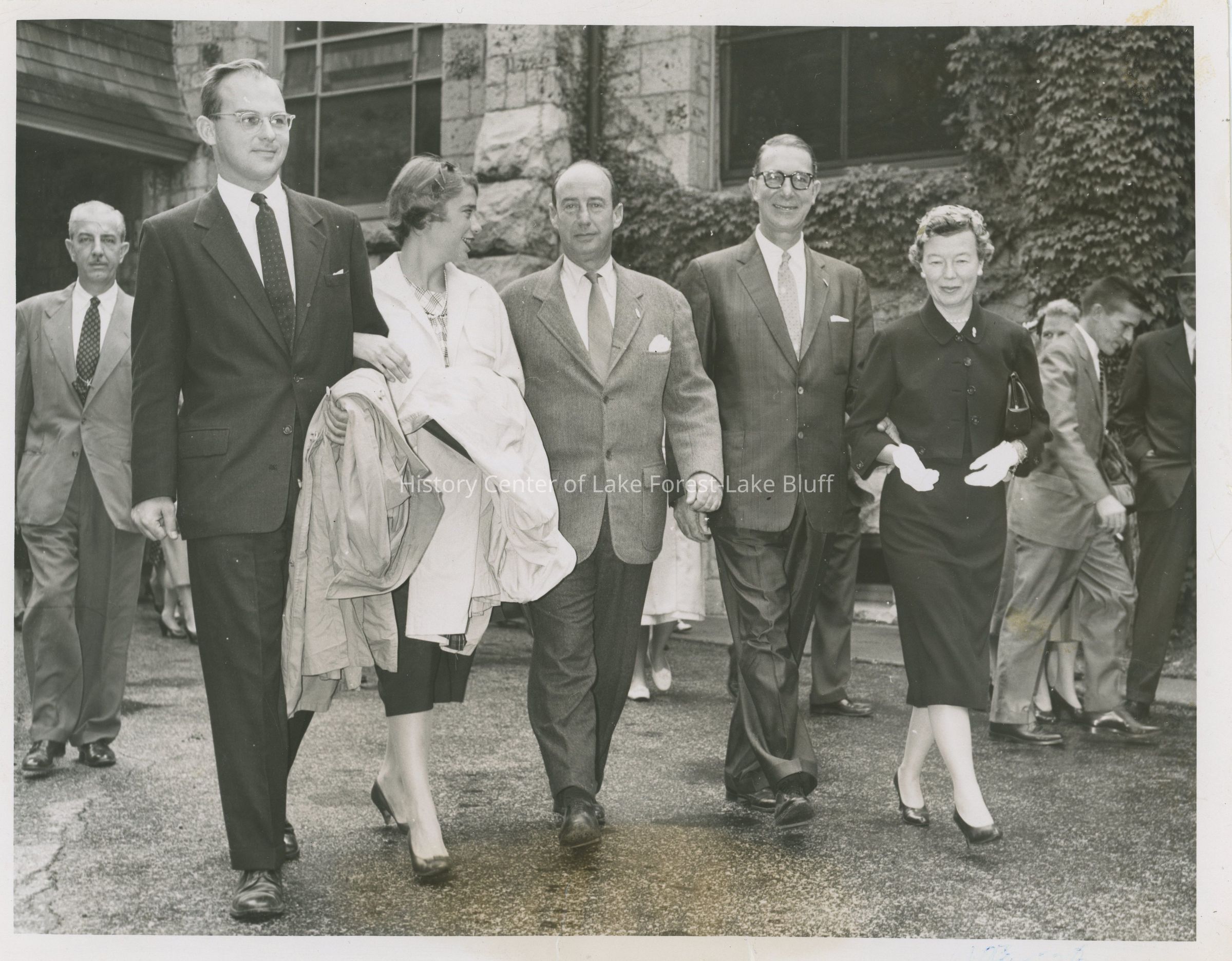"After Church: The Democratic presidential nominee and his running mate round out a happy group as they leave the First Presbyterian Church in Lake Forest, Ill., north of Chicago, Aug. 26. Left to right are Adlai Stevenson Jr., his wife, Nancy, Democratic presidential nominee Adlai Stevenson, Sen. Estes Kefauver, the vice-presidential nominee, and Mrs. Edison Dick, a friend. The political figures are staying at the Stevenson farm in Libertyville.