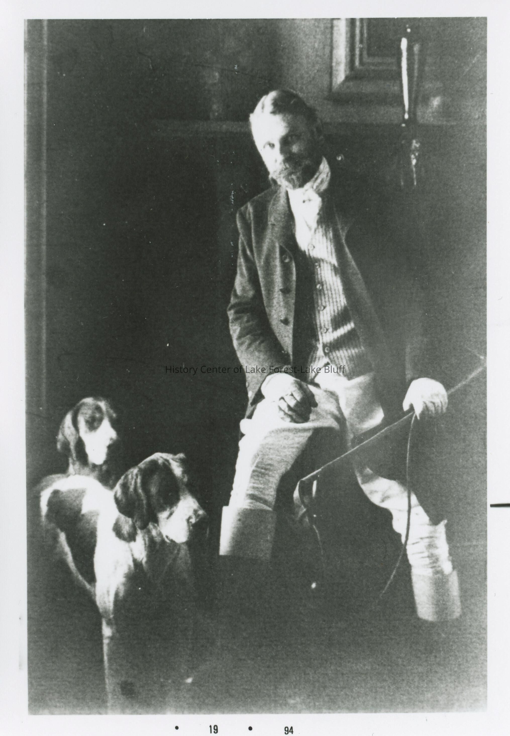 Unlabeled photograph of a middle-aged Arthur Aldis. Subject is sitting on the arm of a chair while holding a riding crop. He is acompanied by two hunting dogs. The object is a recent photograph of the original portrait.