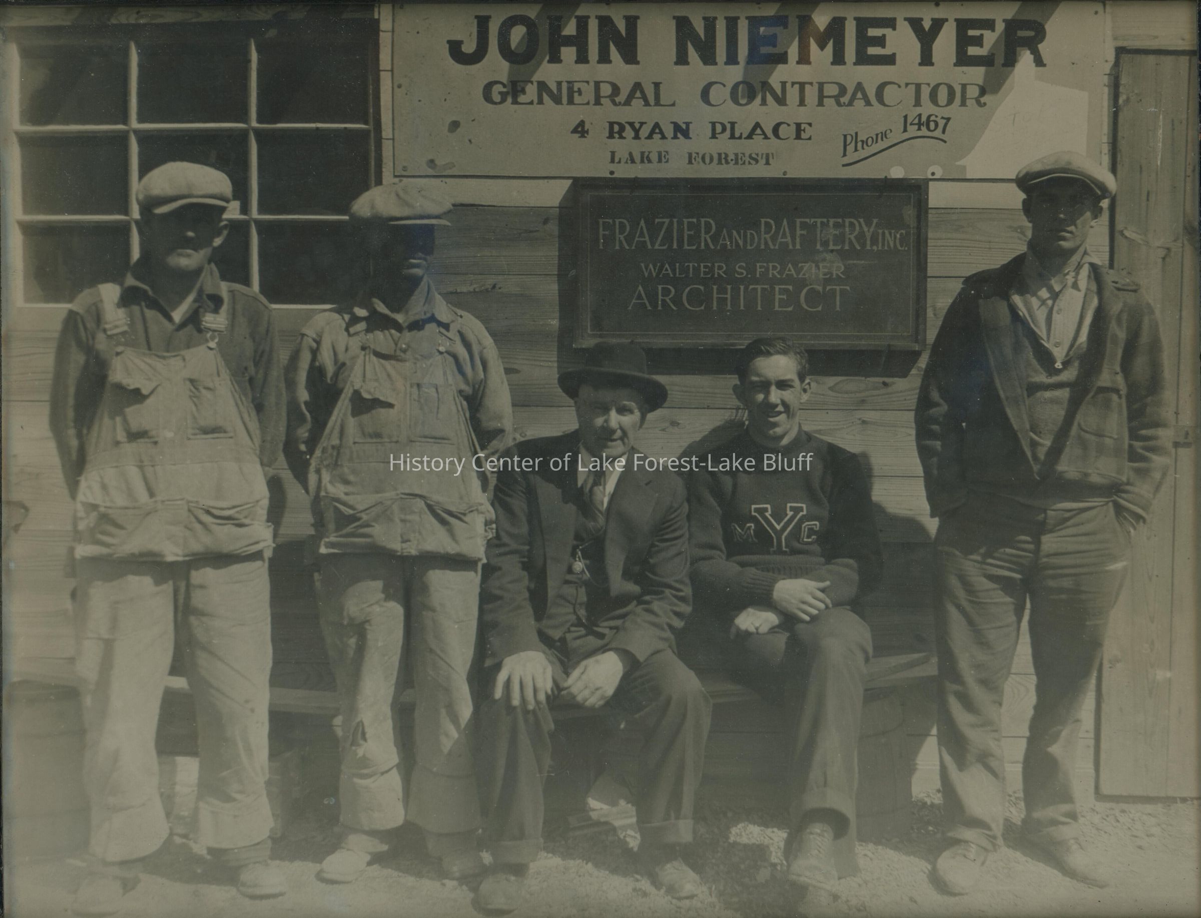Photograph taken in front of John Niemeyer's General Contractor building. Niemeyer was hired by Villa Turicum's architects, to construct the home. Frazier and Raftery Inc's sign can also be seen.