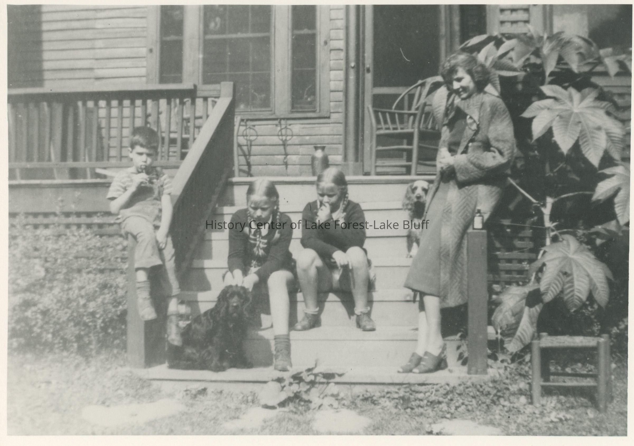 "David Ward, Snoopy (a cocker from "The Big House" that lived to be twenty-one, long enough to see all of the Aldis children grown up), Ruth and Peggy Aldis, Spry (Mary Reynolds Aldis' buff and white crocker), Rowena Fry on the steps to the porch of the Aldis Playhouse. The door was the main entrance."