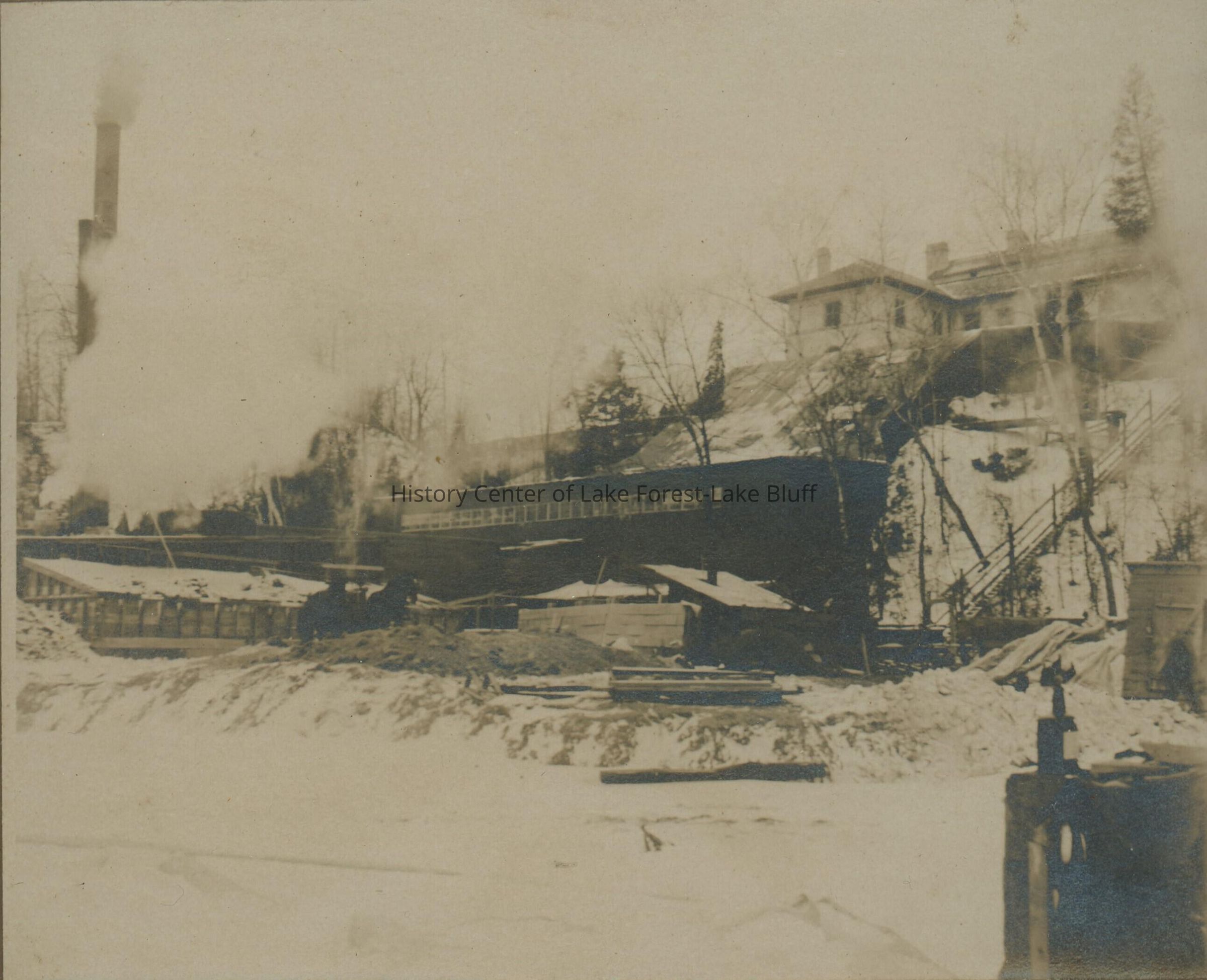 Undated framed photograph of Villa Turicum, Harold F. McCormick's estate, under construction. Photo, taken from the edge of the bluff, captures what would become the waterway, which is still extant.