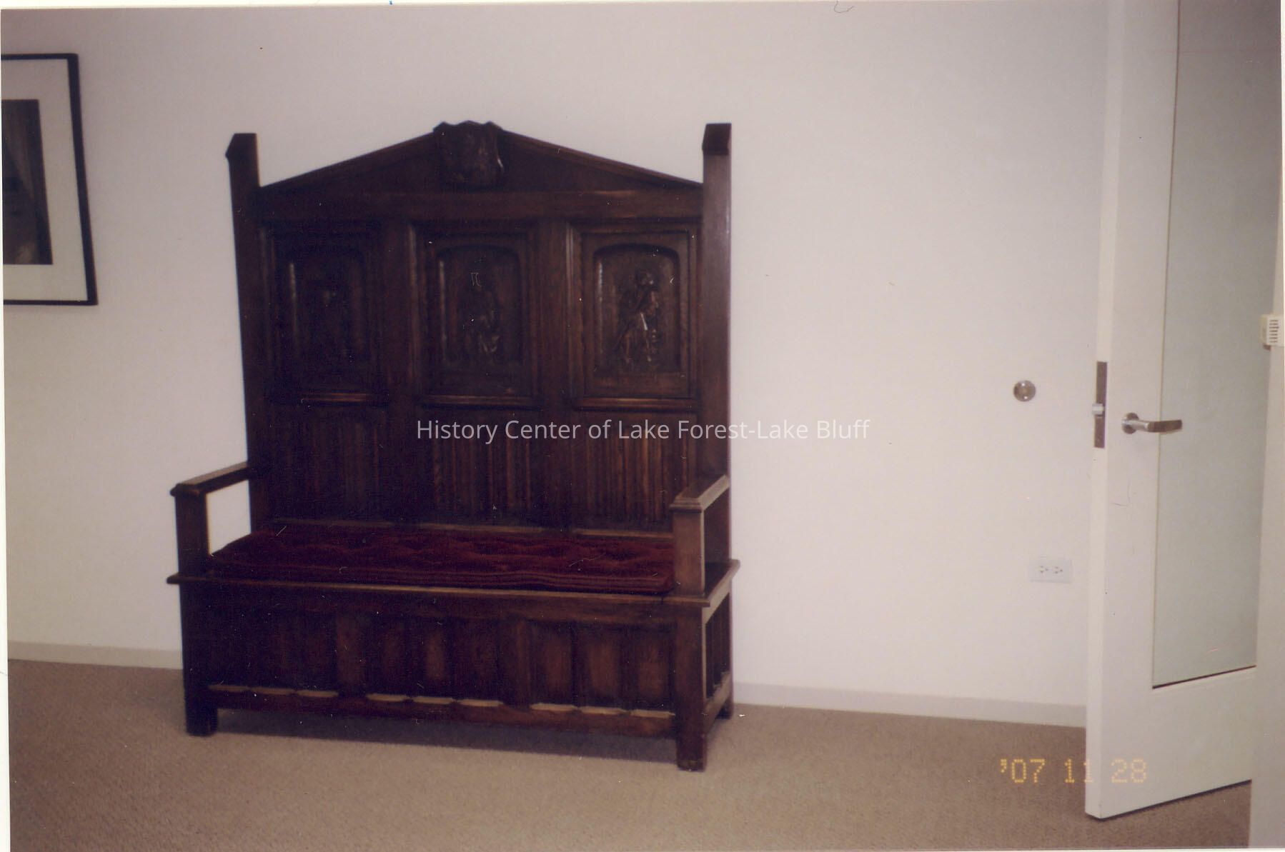 A picture of a wood bench in Barat College duplicate of 2008.10.33