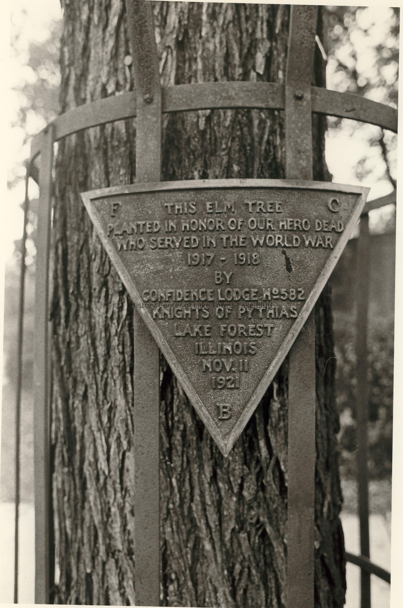 "This elm tree planted in honor of our hero dead who served in the World War 1917-1918 by Confidence Lodge No. 582, Knights of Pythias, Lake Forest, Illinois