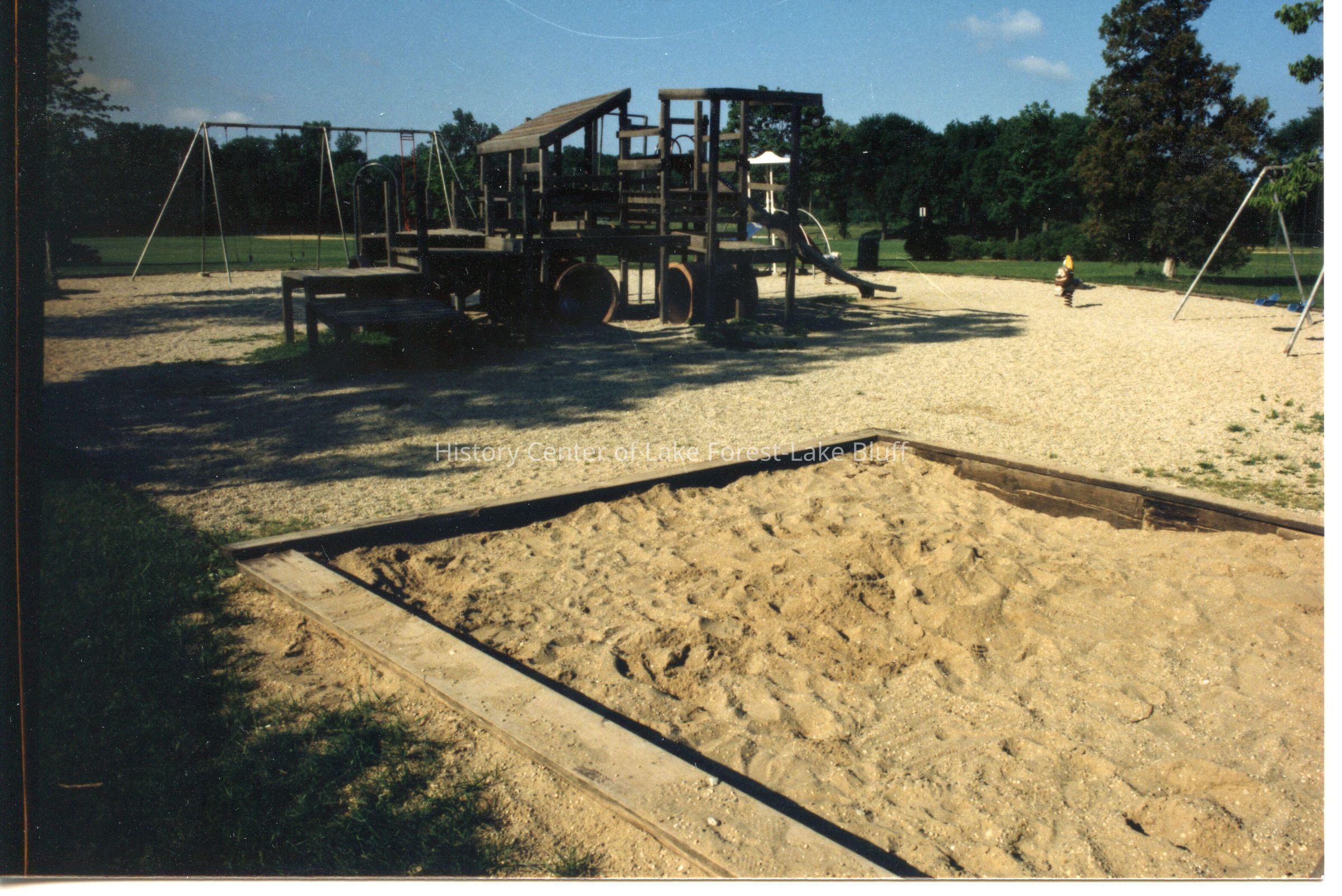 Wooden playground structure at unidentified park. Metal swingsets and a large sandbox are also visible.