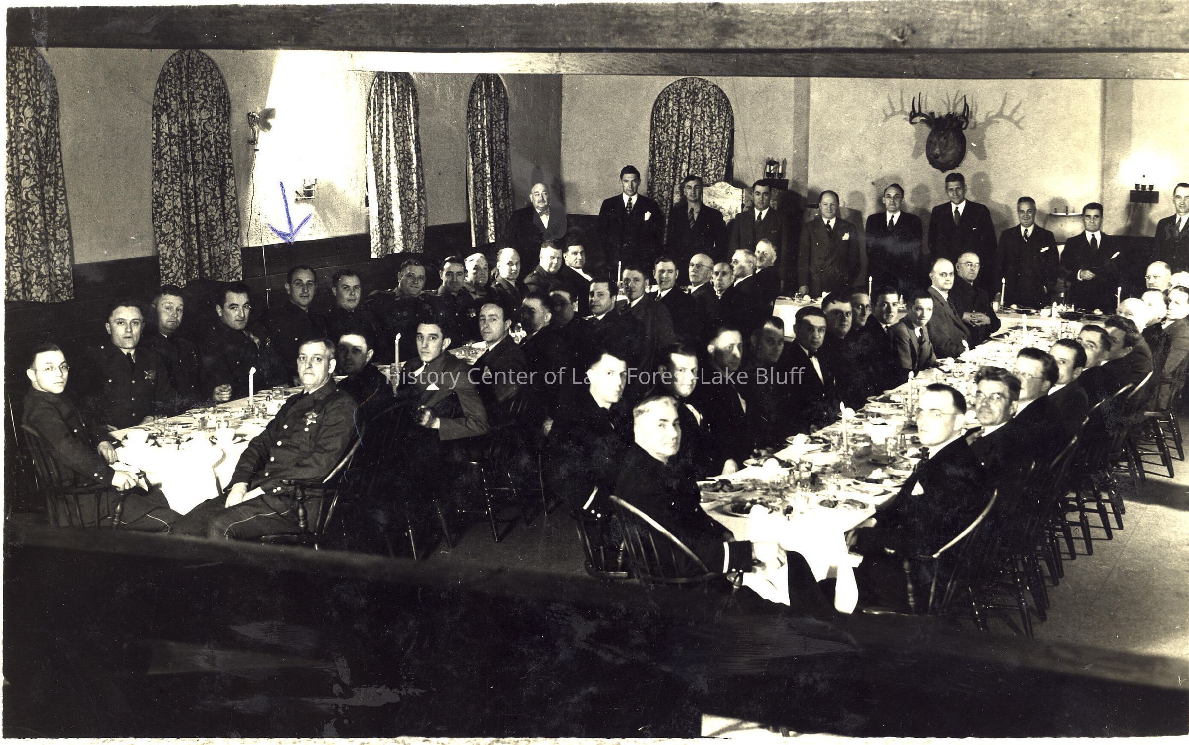 The Lake Forest Police and Fire Departments at dinner with city heads. All men are unidentified, and so is location of dinner.