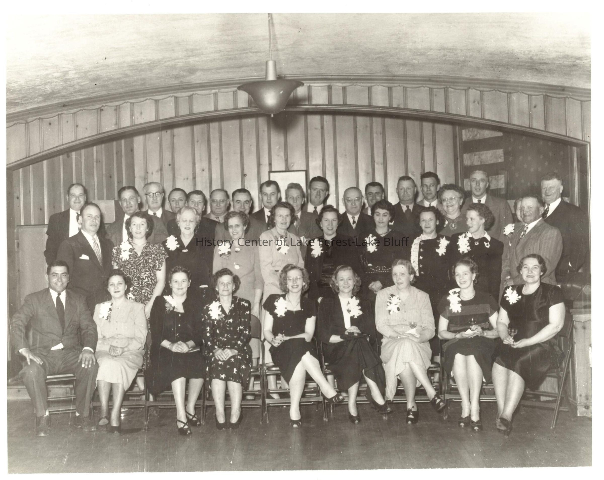 Unidentified group of people posed for a photograph at a police department dance. 1940s-1950s. Wood-panelled interior. Image is reverse of 2005.66.22.