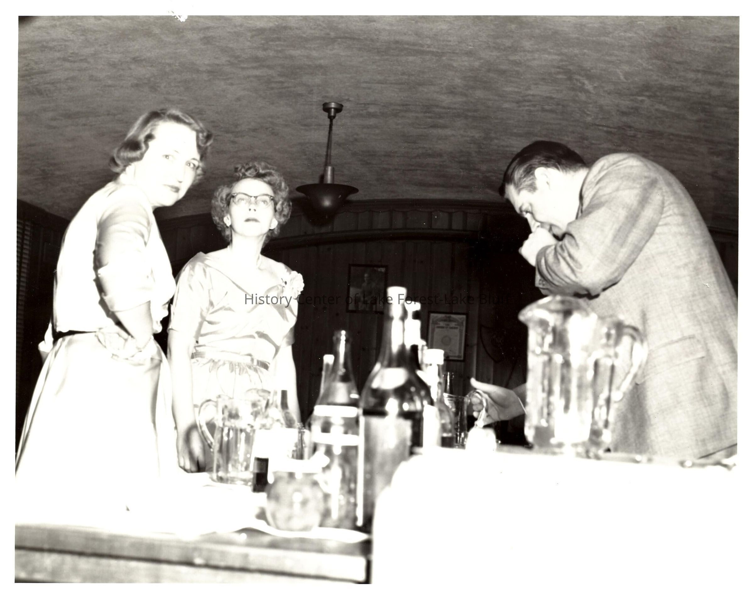 Two women and a man at the bar at a police department dance. All unidentified. 1940s-1950s.
