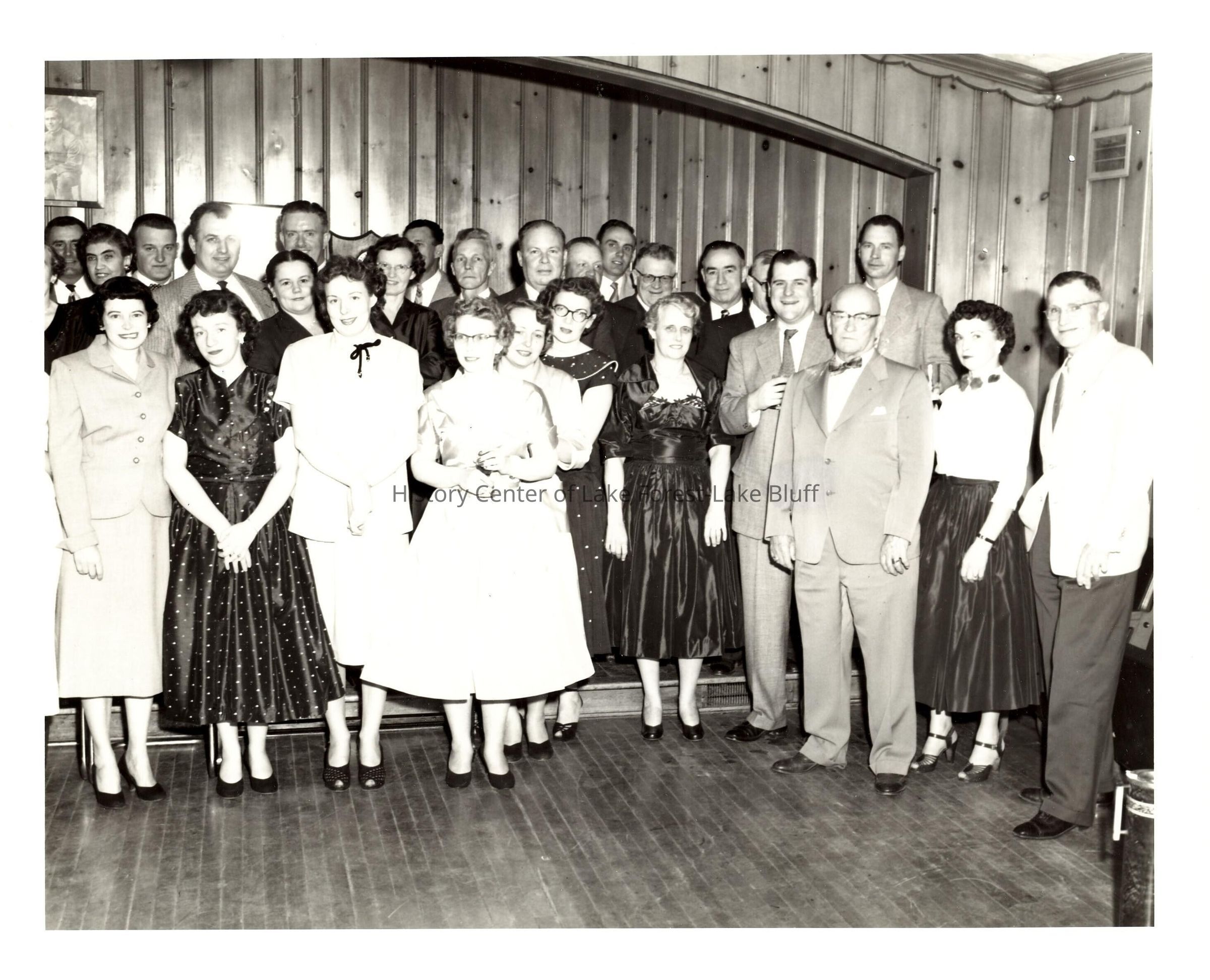 Group of unidentified people standing for a posed photograph at a police department dance. 1940s-1950s.