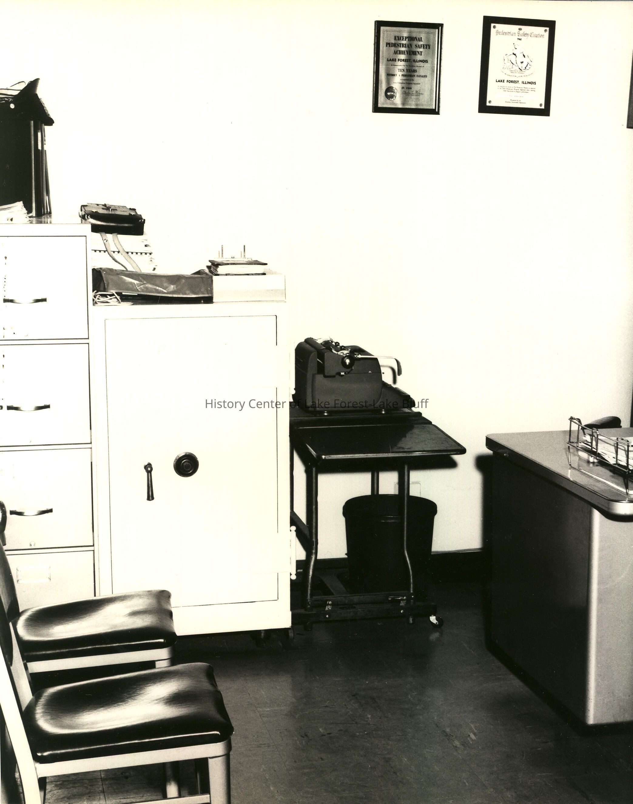 Police department office interior. Chairs, desk, safe, file drawers. On the wall are two plaques, lauding Lake Forest's achievements in pedestrian safety. 1960s.