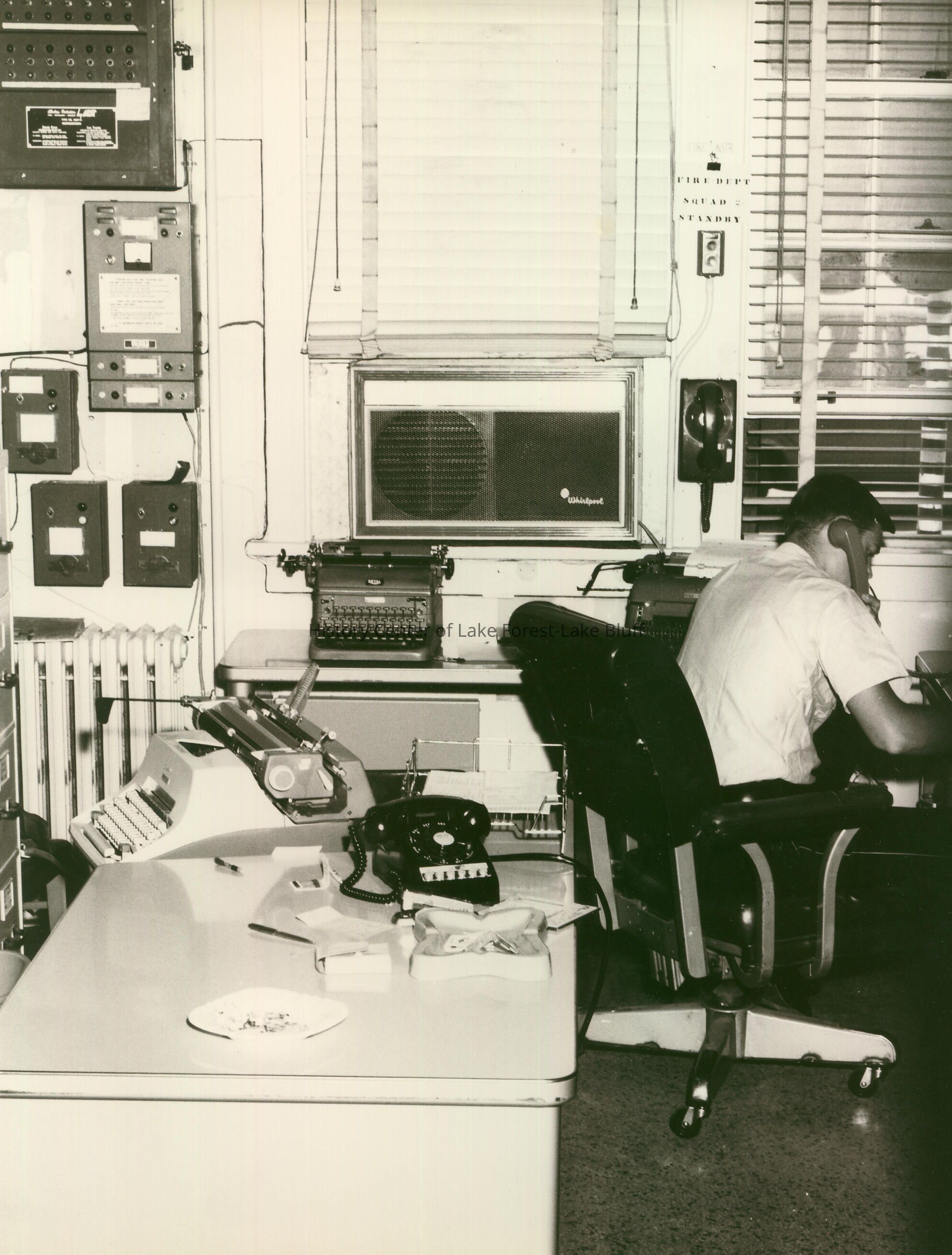 Police department office interior. Typewriters, telephones. Writing on the wall reads "Fire Dept Squad Standy." An unidentified man is seated and talking on the phone.