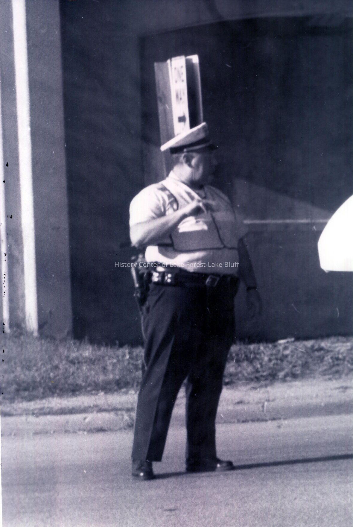 Unidentified police officer standing in the street. Photo is blurry, and has a tear.