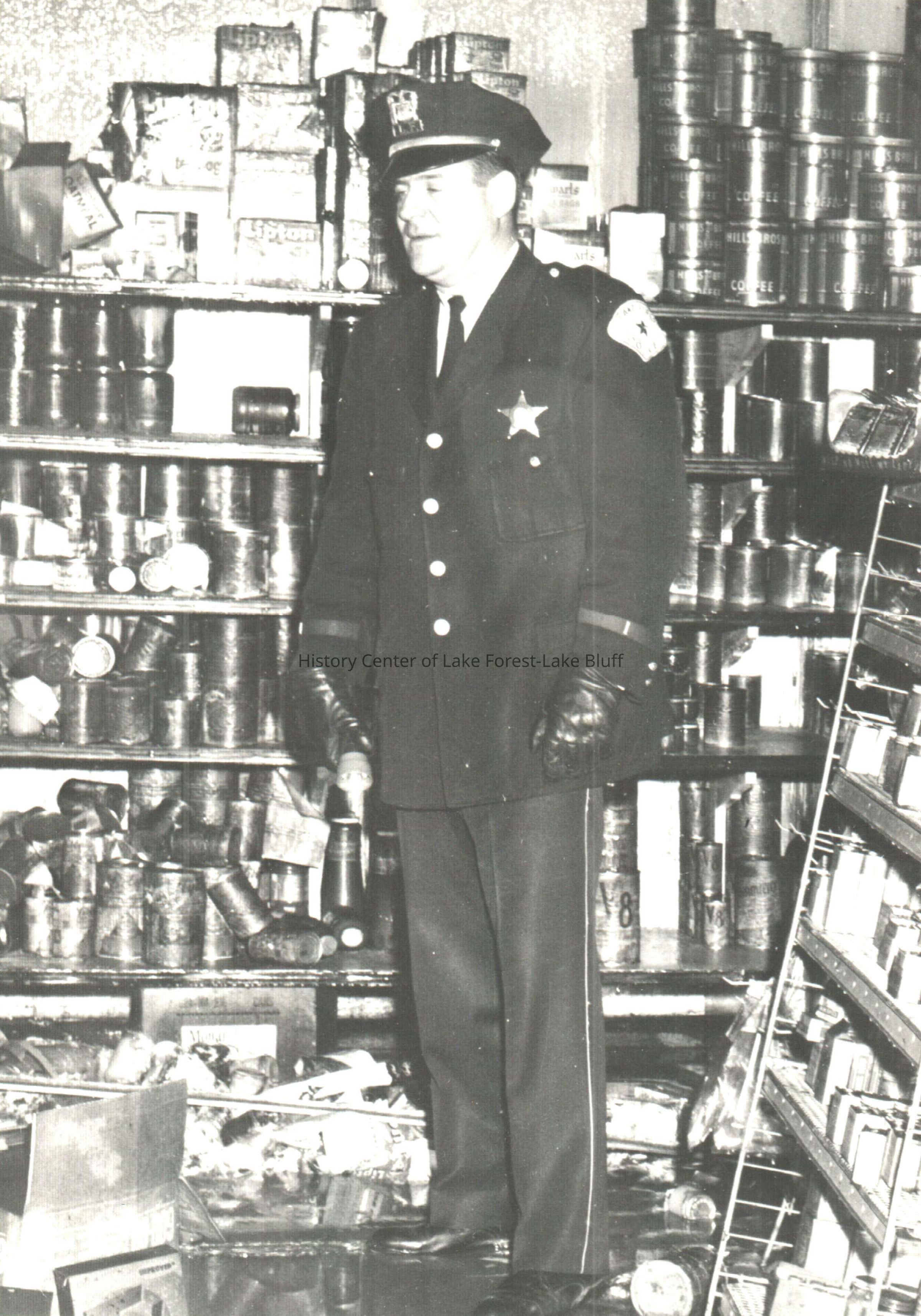 An Lake Forest police officer standing in what appears to be a storeroom. May be Mark Nelson There are shelves with cans of tea, oatmeal, coffee, and V8. The shelves are messy and stuff is strewn about on the floor. Undated.