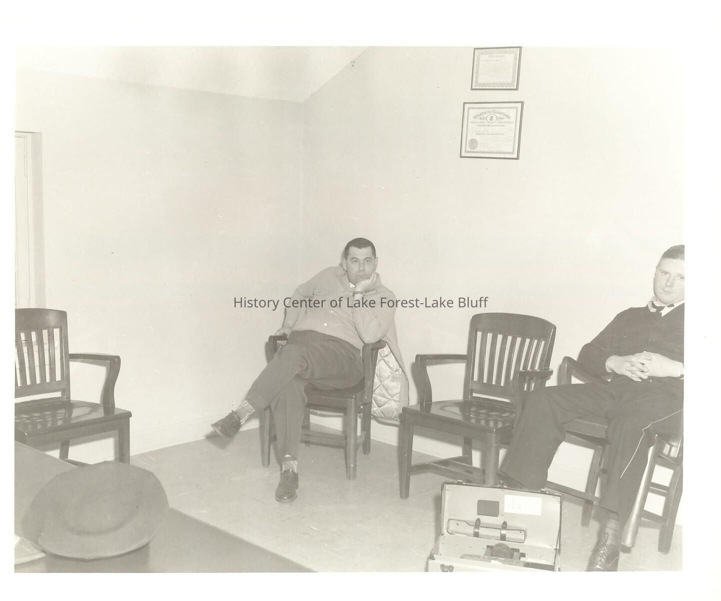 Two unidentified men sitting in chairs. There is a certifcate on the wall that says "Police Magistrate" and an open kit on the floor. The man on the right is the same as the man on the left in 2005.66.48.