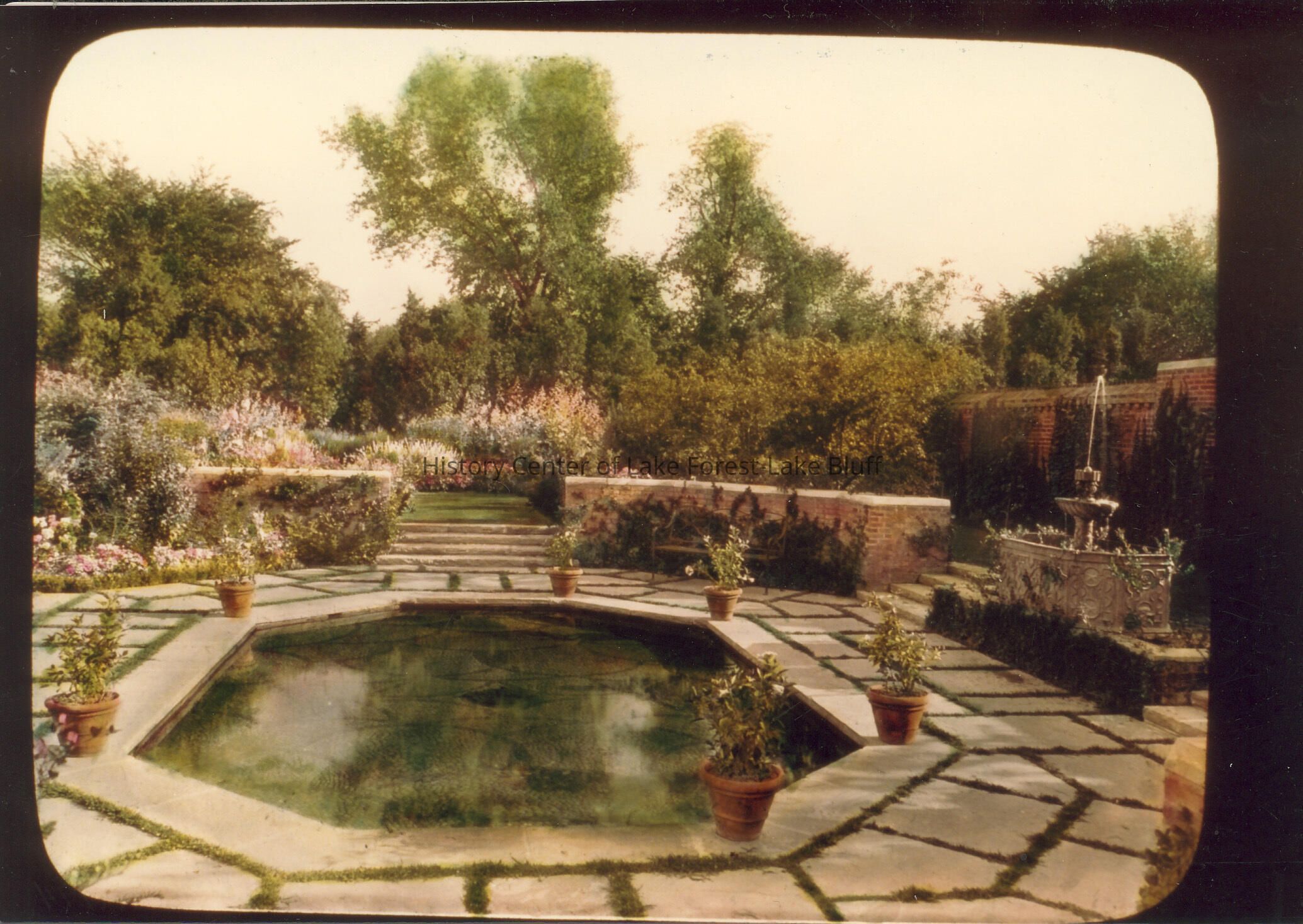 Color photograph of octagonal pool with fountain and high brick wall at right, and low brick wall in center on either side of stairs leading to garden