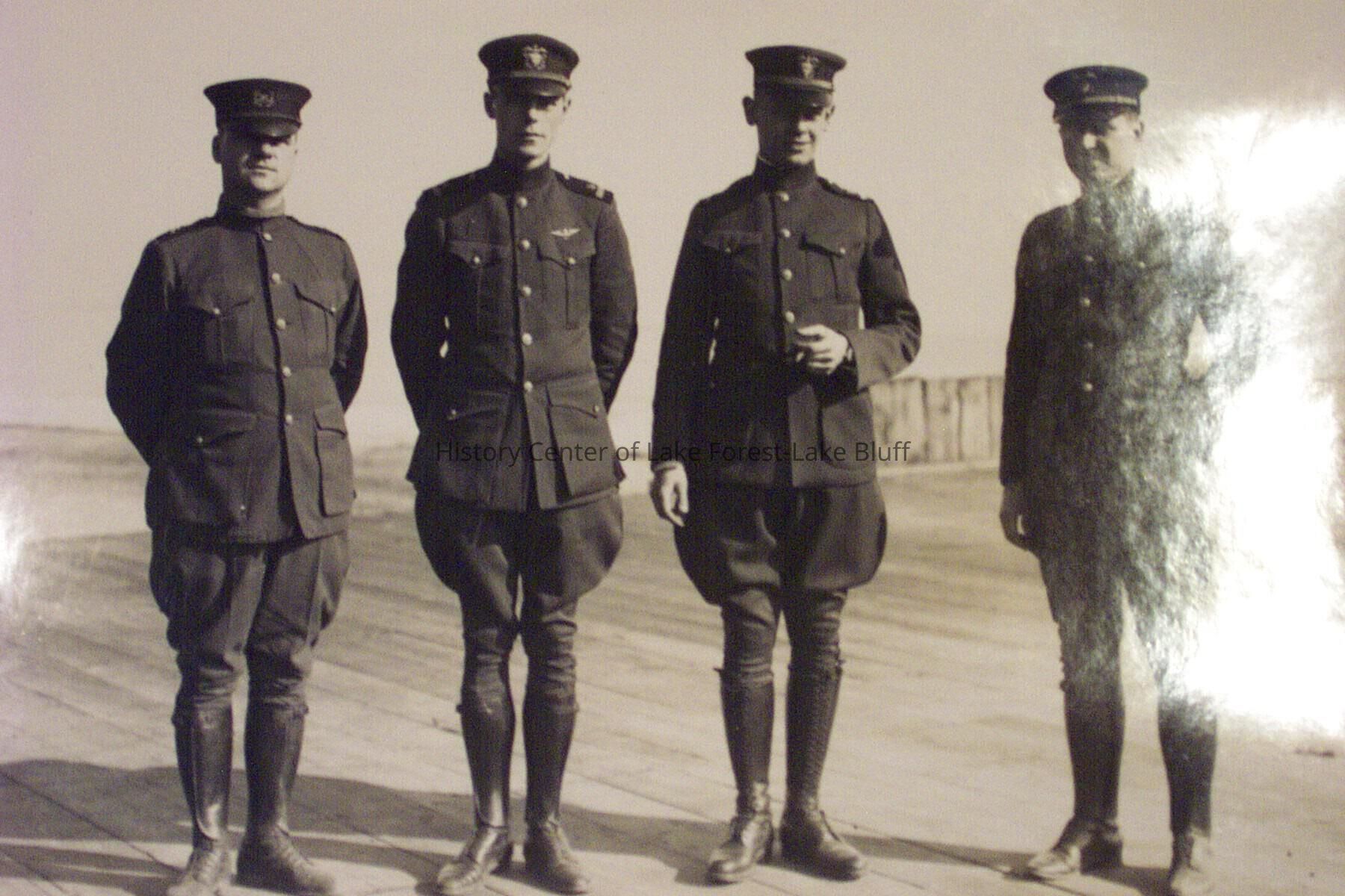 Portrait of 4 sailors standing in dress blues, outside. Pants are tight against the calf as though ready to ride a horse. Glossy print.