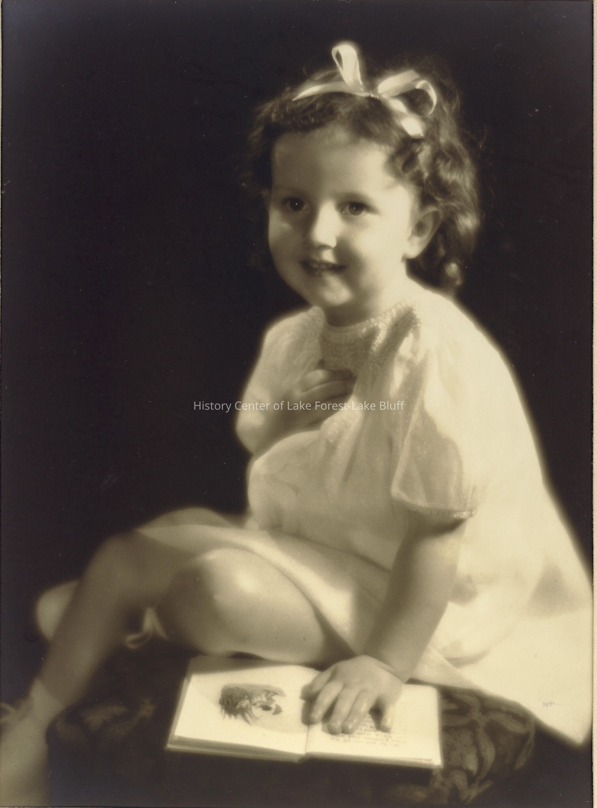 Brown haired girl seated on stool, left hand on book while right hand on chest. She is wearing a light colored dress. mounted in bifold folder.