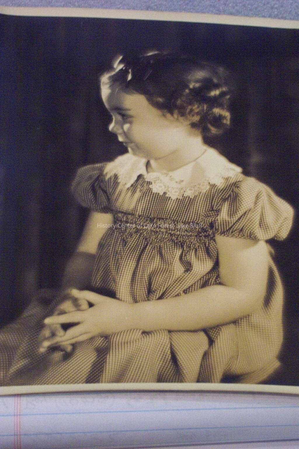 Portrait of girl (7?) in check dress with lace collar. hands clasped in lap