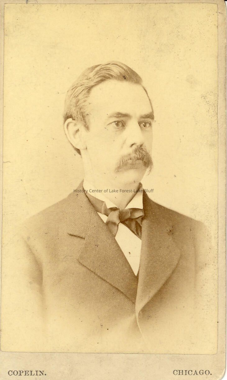 Portrait of James S. Harvey in profile to the right, Harvey family member, Lake Bluff. His hair is dark and parted to the side, has a long mustache and wears a suit with a bow tie. Lower right hand of photo reads "Chicago" and lower left hand reads "Copelin." Back of photo reads: " James S. Harvey" and there is a faded logo for the Copelin company with the address 244 West Washington Street, ChicagoLexicon