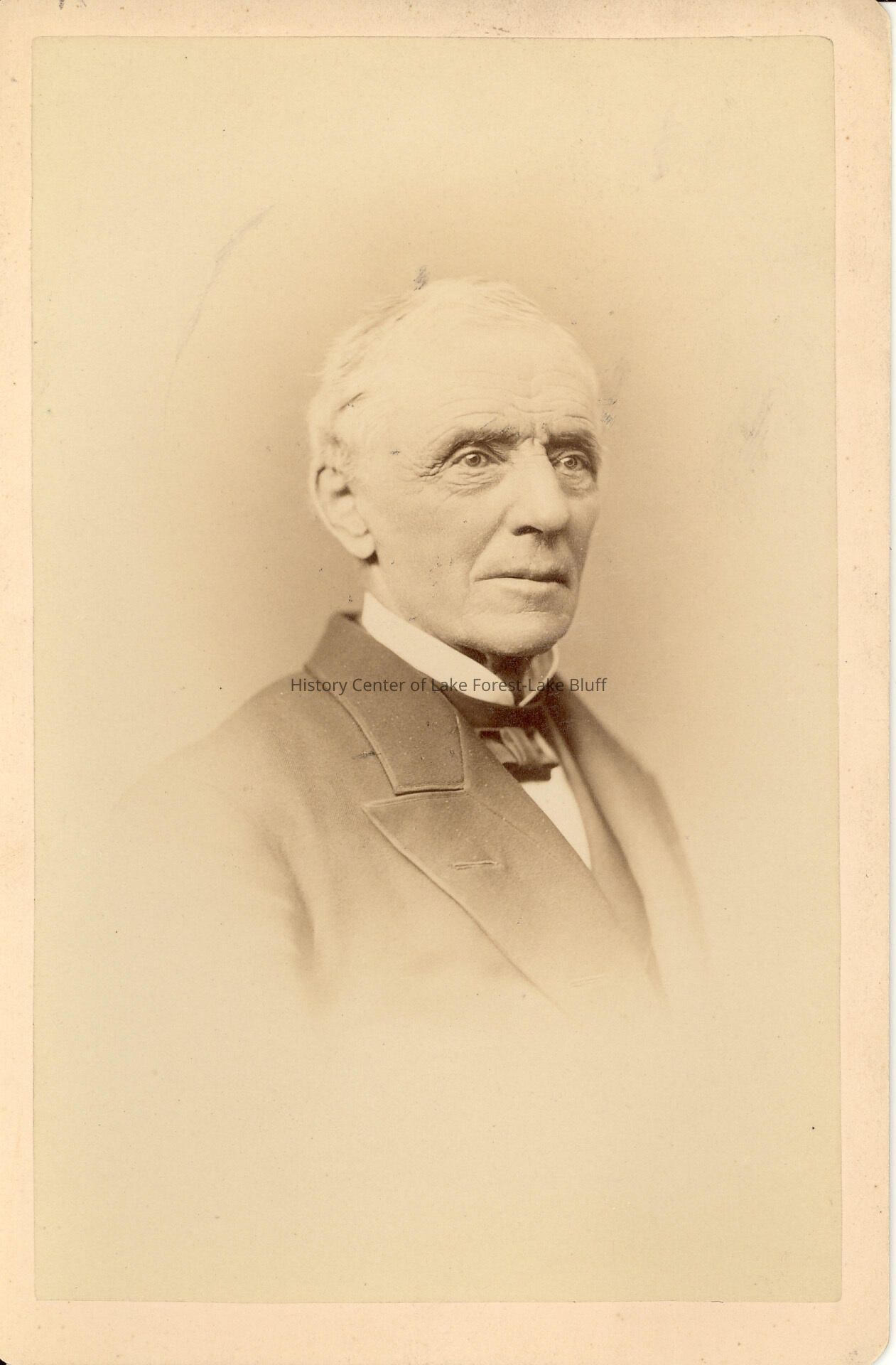 Portrait of James Warren Harvey, in profile to the right, Harvey family member, Lake Bluff. He wears a black suit with a bow tie in the photo and has white/gray hair - he is an older gentleman. Photo has been lightly touched up, to give him rosy cheeks. Back of photo reads: "James Warren Harvey, taken about 1882, age about 75 yrs. Wm. Nims, Fort Edward, 30791, New York."Lexicon
