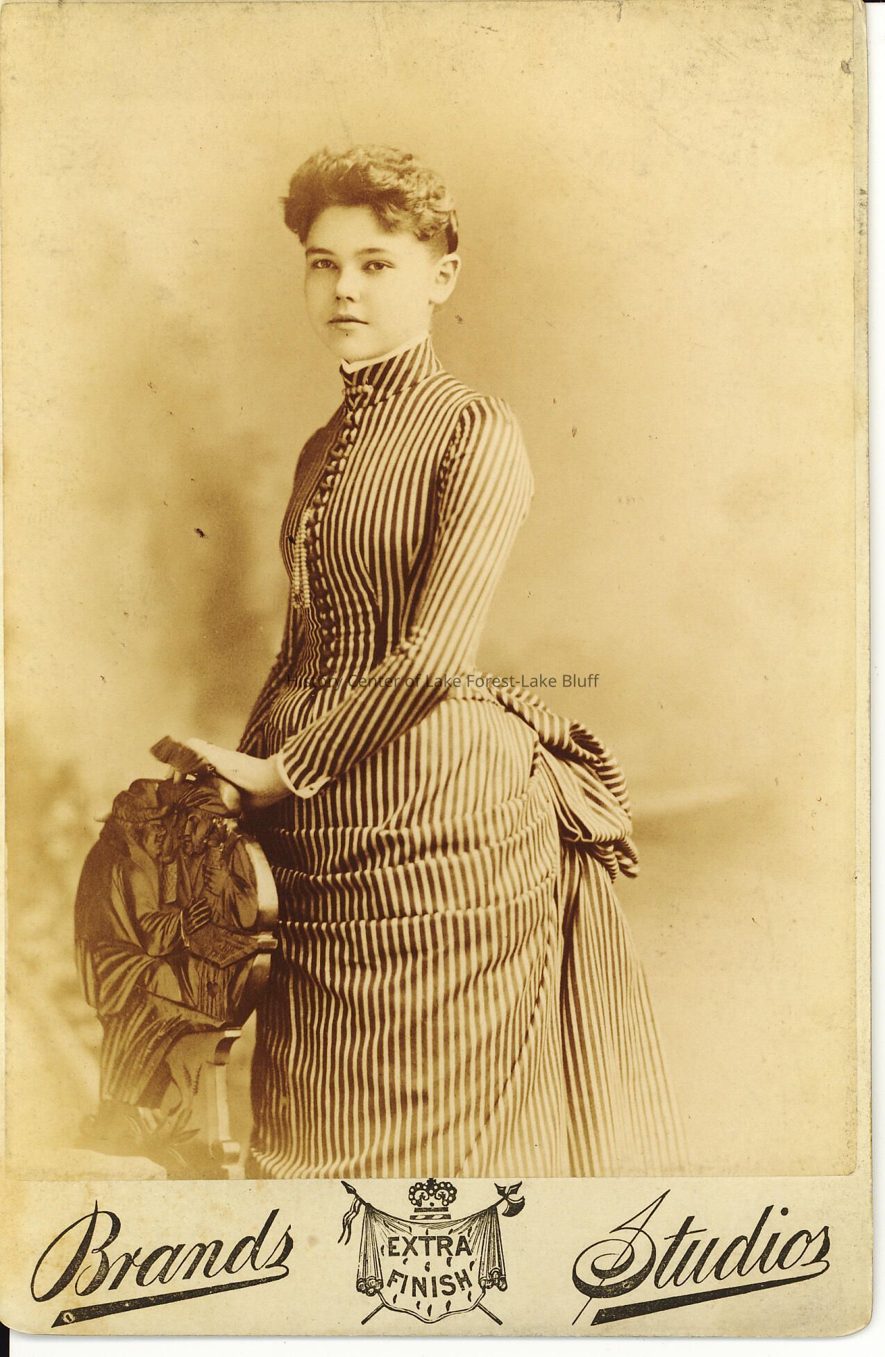 Portrait of Sara Belle Harvey standing in profile to the left, Harvey family member, Lake Bluff. She is wearing a dress with stripes and has her hands folded in front of her placed on top the back of a chair. At the bottom of the photo it reads: " Brands - Extra Finish -Studios." The back of the photo reads: " Sara Belle Harvey...Brand 210 & 212 Wabash Avenue, Portraits, Established 1858, Chicago. This Negative is carefully preserved for future orders. Duplicates furnished at any time."Lexicon