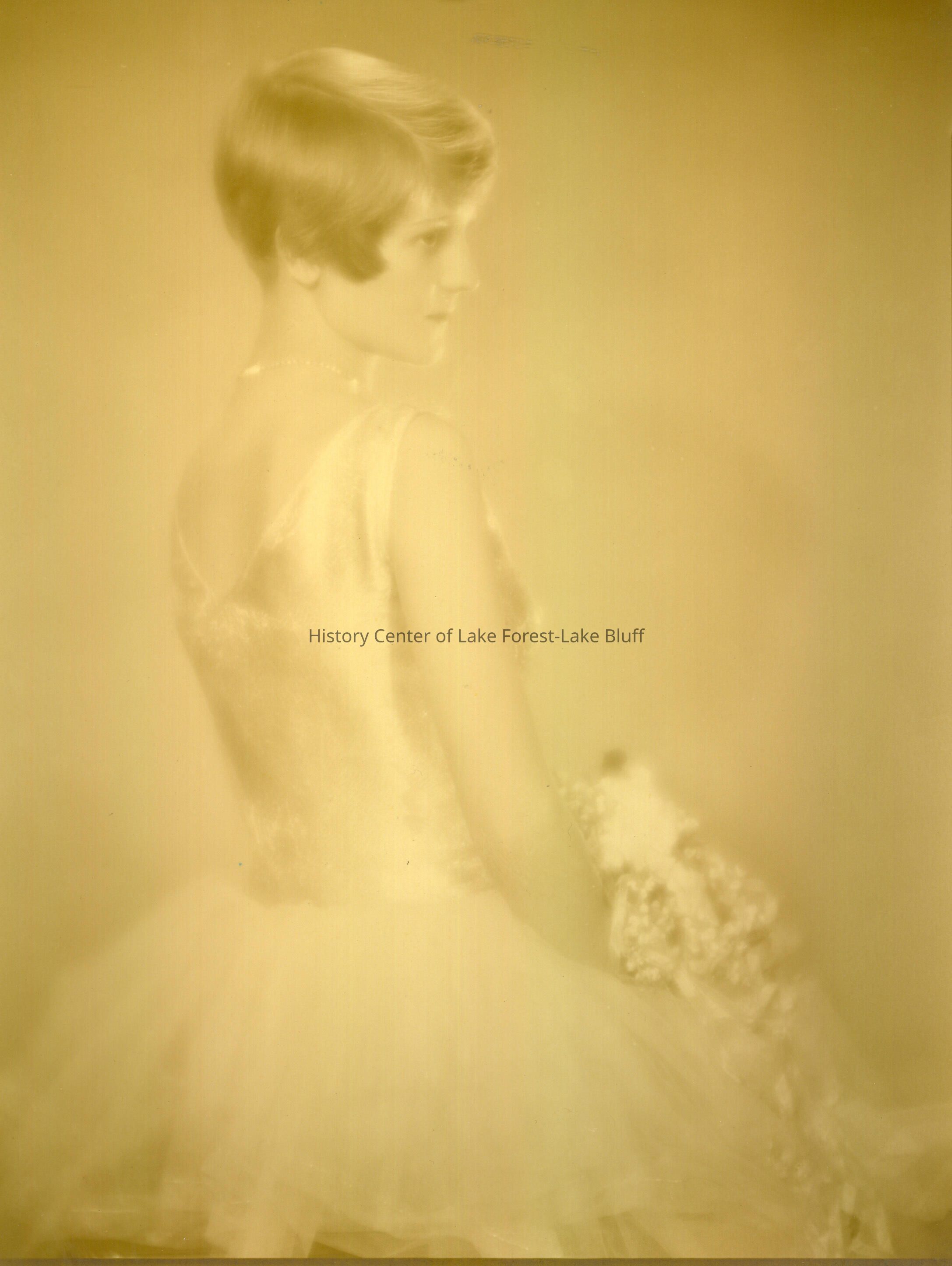 Portrait of young lady in sleeveless dress with tulle skirt holding flowers. Profile. short hair. bridal party?
