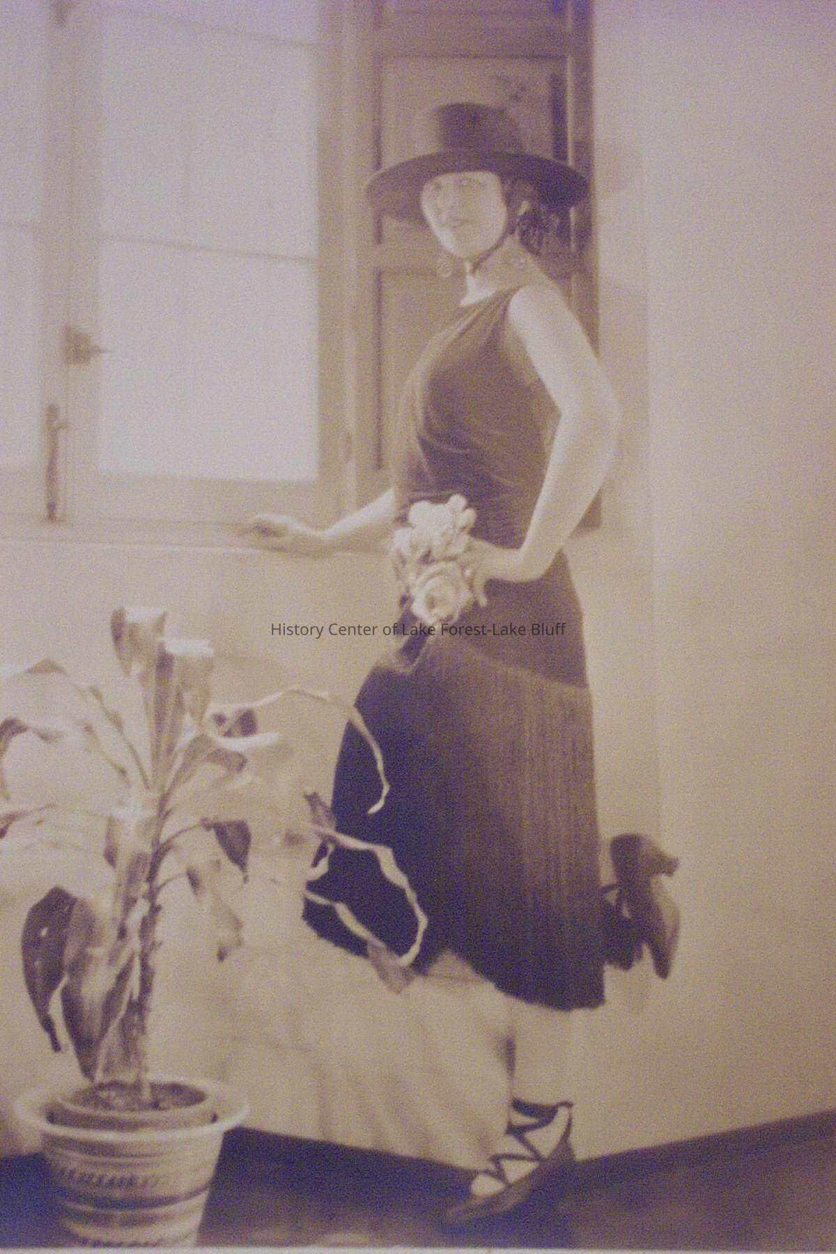 Portrait of young woman standing at window with plant. She is wearing a hat, sleeveless dark dress with lots of fringe. Shoe crisscross lace up front