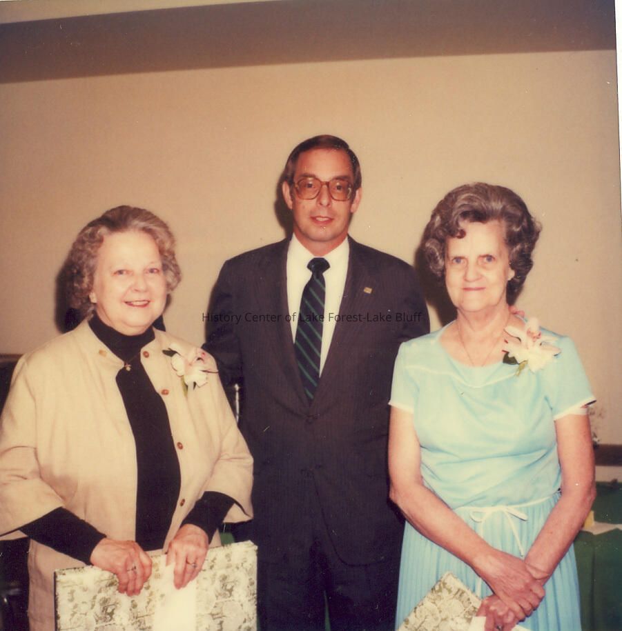 Steve Seiler between two women who are wearing corsages. Lady on the right is Mrs. Walton. Each is holding a wrapped gift. Photographs relating to Lake Forest Hospital collected for the 100th Anniversary of the Hospital by the Development Department.