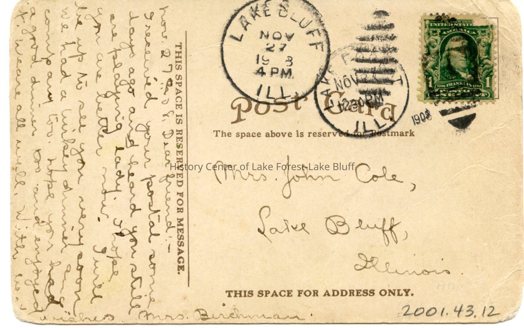 postmarked November 27, 1908 to Mrs. John Cole in Lake Bluff, Il.
