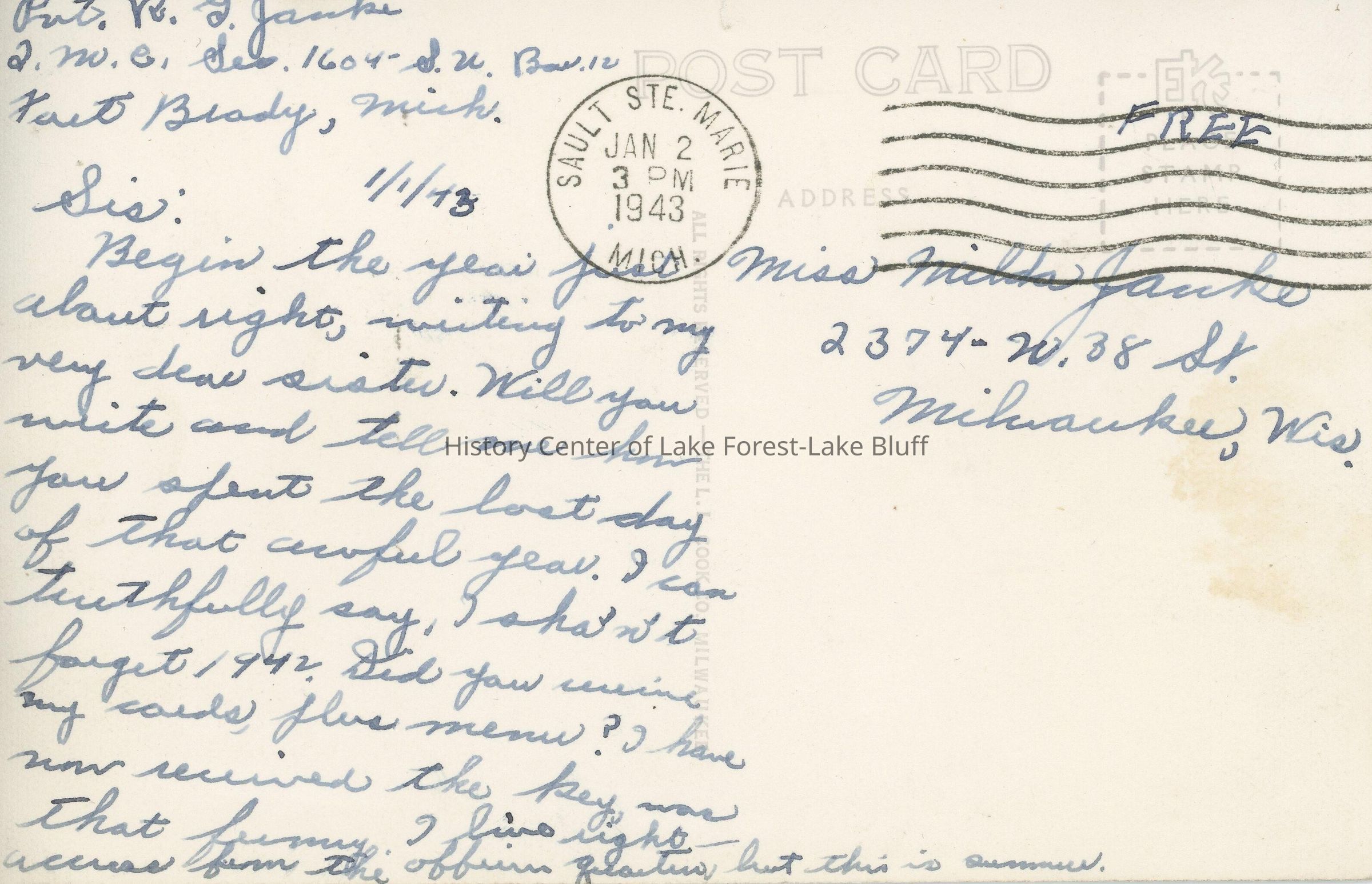 Postcard written by Private Rudolph Janke to his sister, Milda Janke. Rudolph died in 1945, two years after these were written.