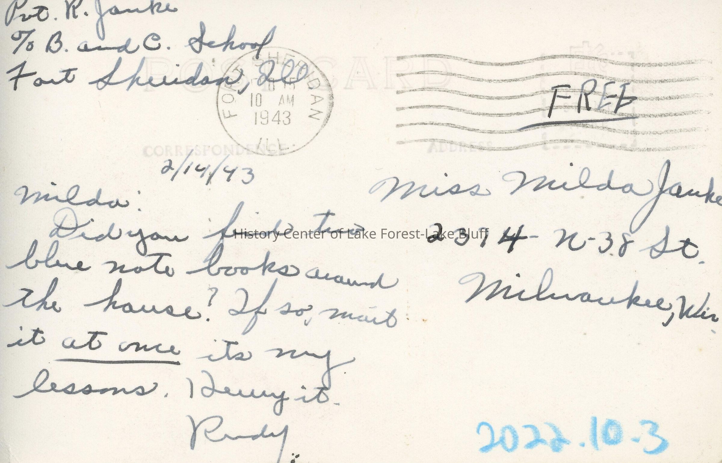 Written by Pvt Rudolph Janke to his sister Milda Janke. Rudolph died in 1945, two years after these were written.