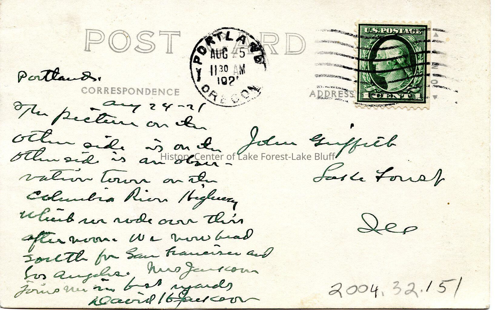 Postcard from Portland, Oregon to John Griffith of Lake Forest, depicting Vista House, an octagonal stone observation tower on the Columbia River Highway