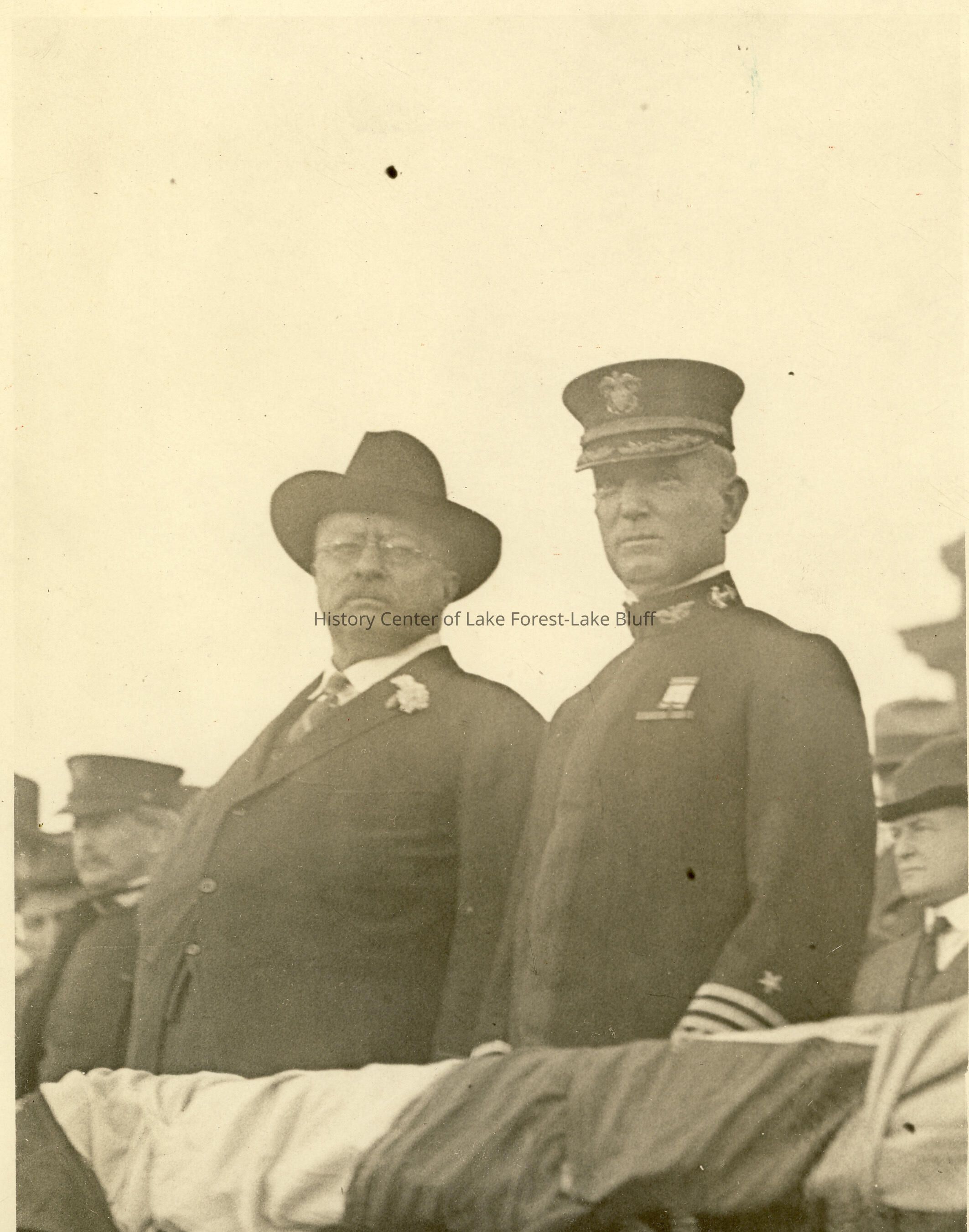 written on back of photo by Eleanor Boyne-President Theodore Roosevelt and Captain William A. Moffett on what appears to be a reviewing stand. According to my notes, President Roosevelt visited Great Lakes in September 1917. A "review" in early days consisted of several bands totaling 1500 musicians marching by; followed by battalions of four companies (in their singing squares formation with a hollow center) with a band in the middle of each battalion. The men would sing as they came past the reviewing stand. The first five Commandants were Captains, although Ross made Rear Admiral in the billet. Moffett became the Air Admiral when the Bureau of Aeronautics was formally established in 1921.