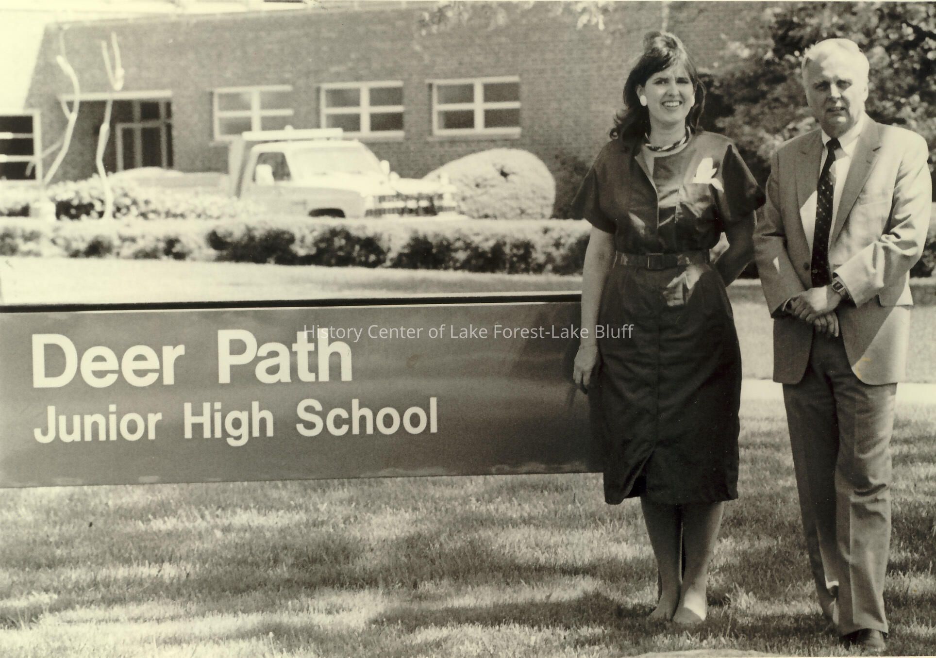 Image taken in front of Deerpath Junior High School featuring sign. May 1987. Rosemary Ferche, Assistant Principal and Richard Howell, Principal