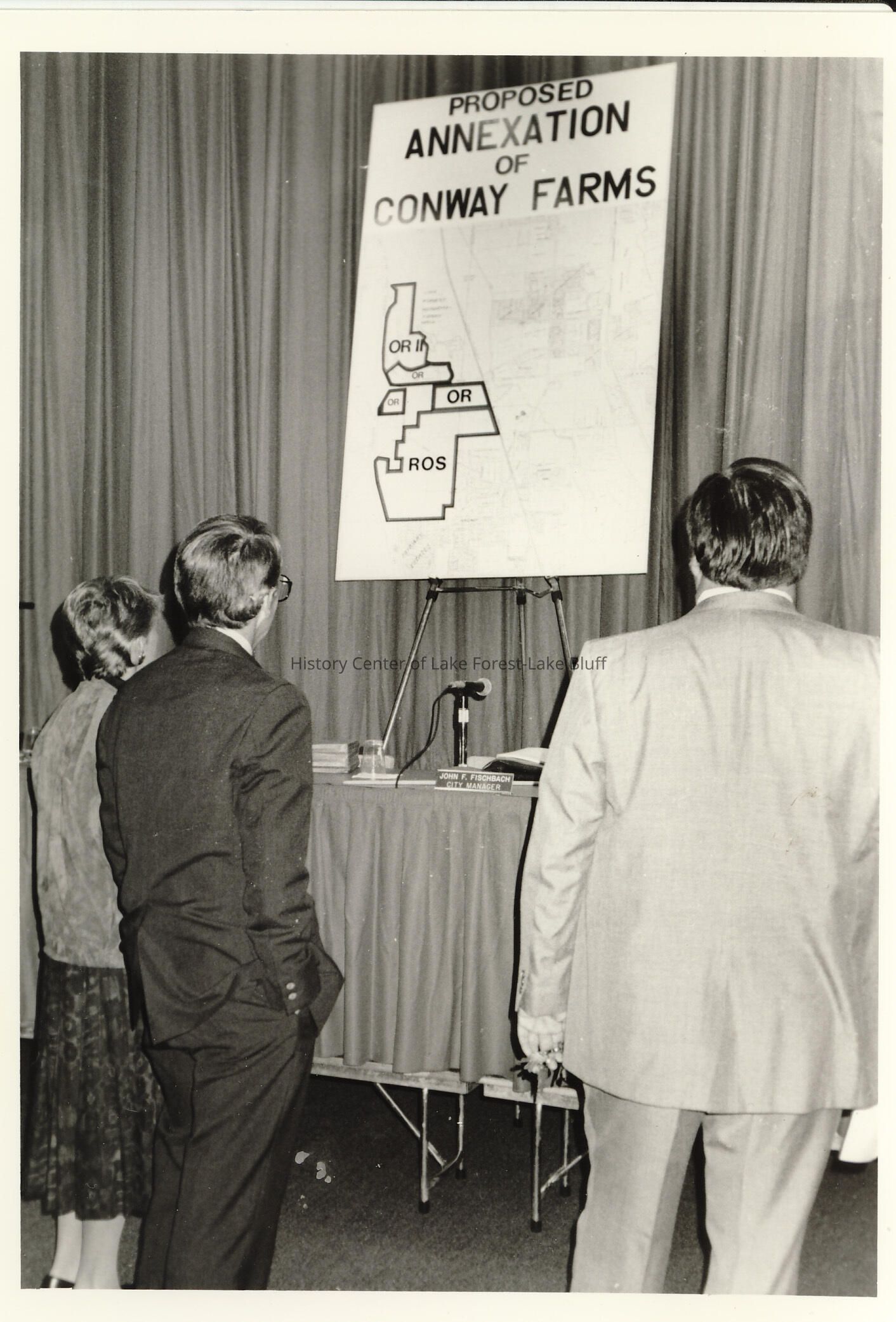 Proposed Annexation of Conway Farms, Lake Forest, October 6, 1988. Photo shows three people with poster at a meeting about the annexation of the Conway Farms area to the City of Lake Forest.