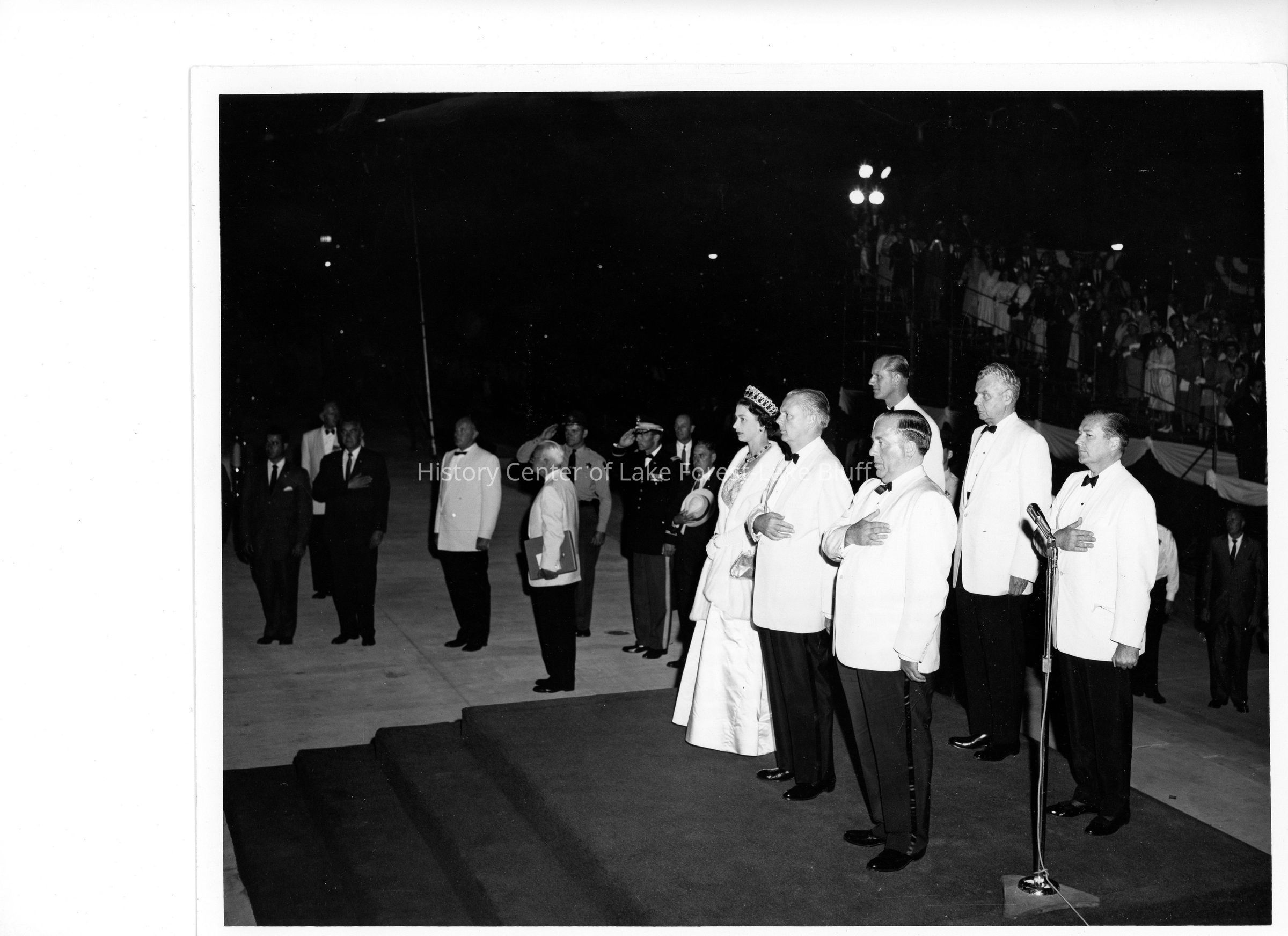 "Fifth U.S. Army Band, Armed Forces Honor Guard, and U.S. Army Bandsmen participate in night ceremony at Lake Michigan pier which marked departure of Queen Elizabeth and Prince Philip of Great Britain after first-tome visit to Chicago on July 6, 1959. They boarded the royal yacht, Britannica, which has traversed St. Lawrence Senway. In front row (from left) on pier dais are Queen Elizabeth, William G. Stratton, Governor or Illinois, and Mayor Richard J. Daley of Chicago. In second row, Prince Philip, Prime Minister John Diefenbaker of Canada and Wiley Buchanan, Chief of Protocol, U.S. Department of State."Photograph Details
