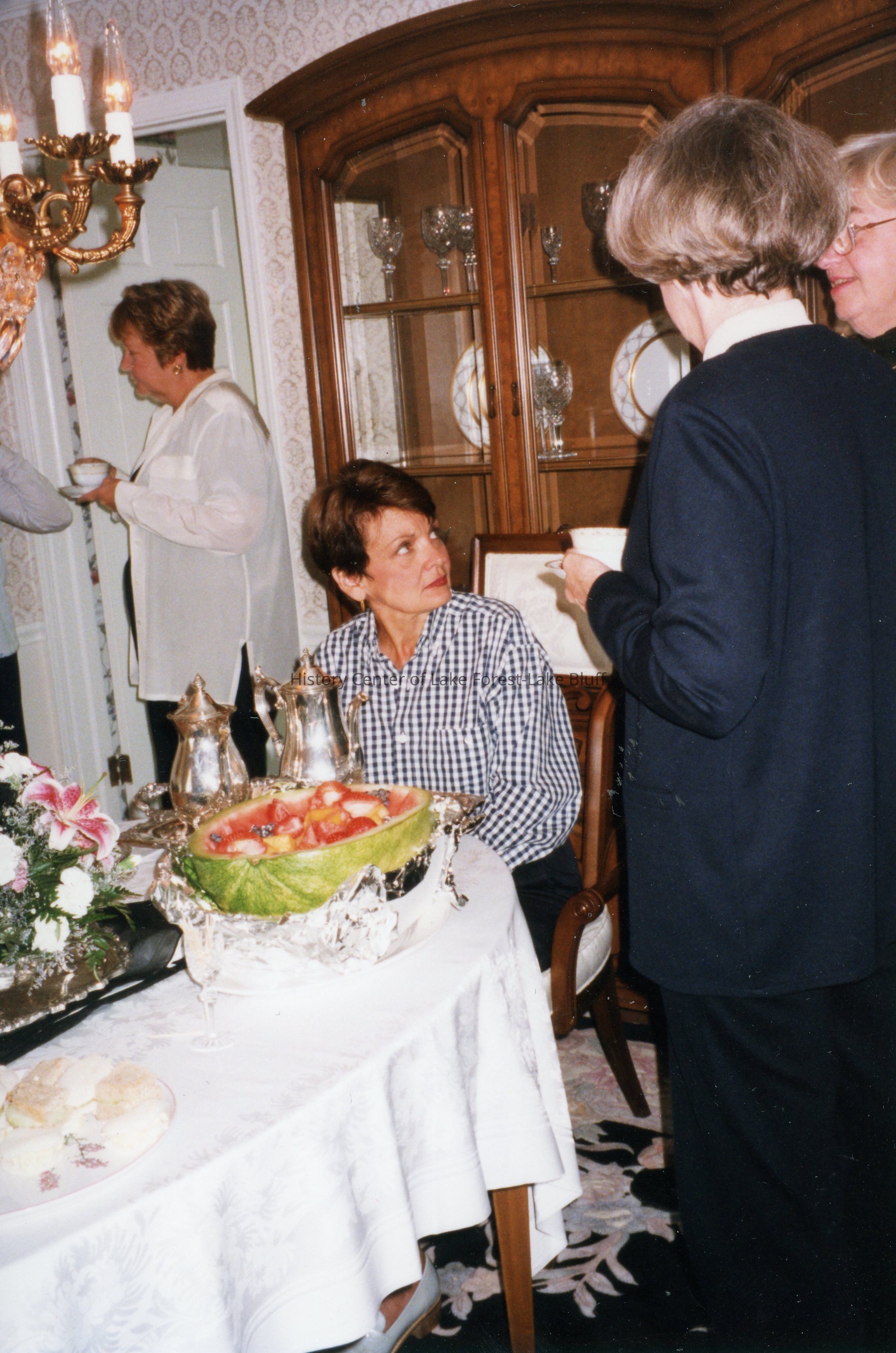 An unidentified woman sits at a table during an event hosted by the Market Square Questers. Two copies of photo.Photograph Details